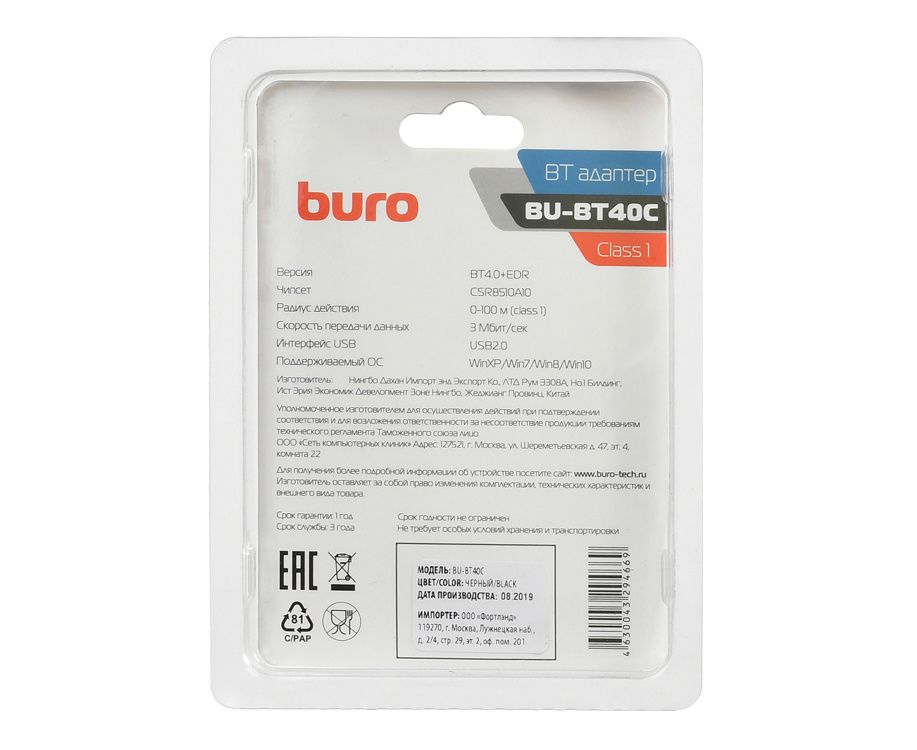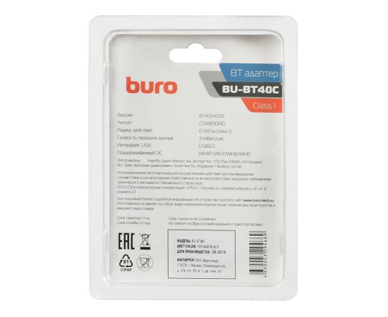 Адаптер Buro BU-BT40С Bluetooth 4.0+EDR USB class 1 100м черный
