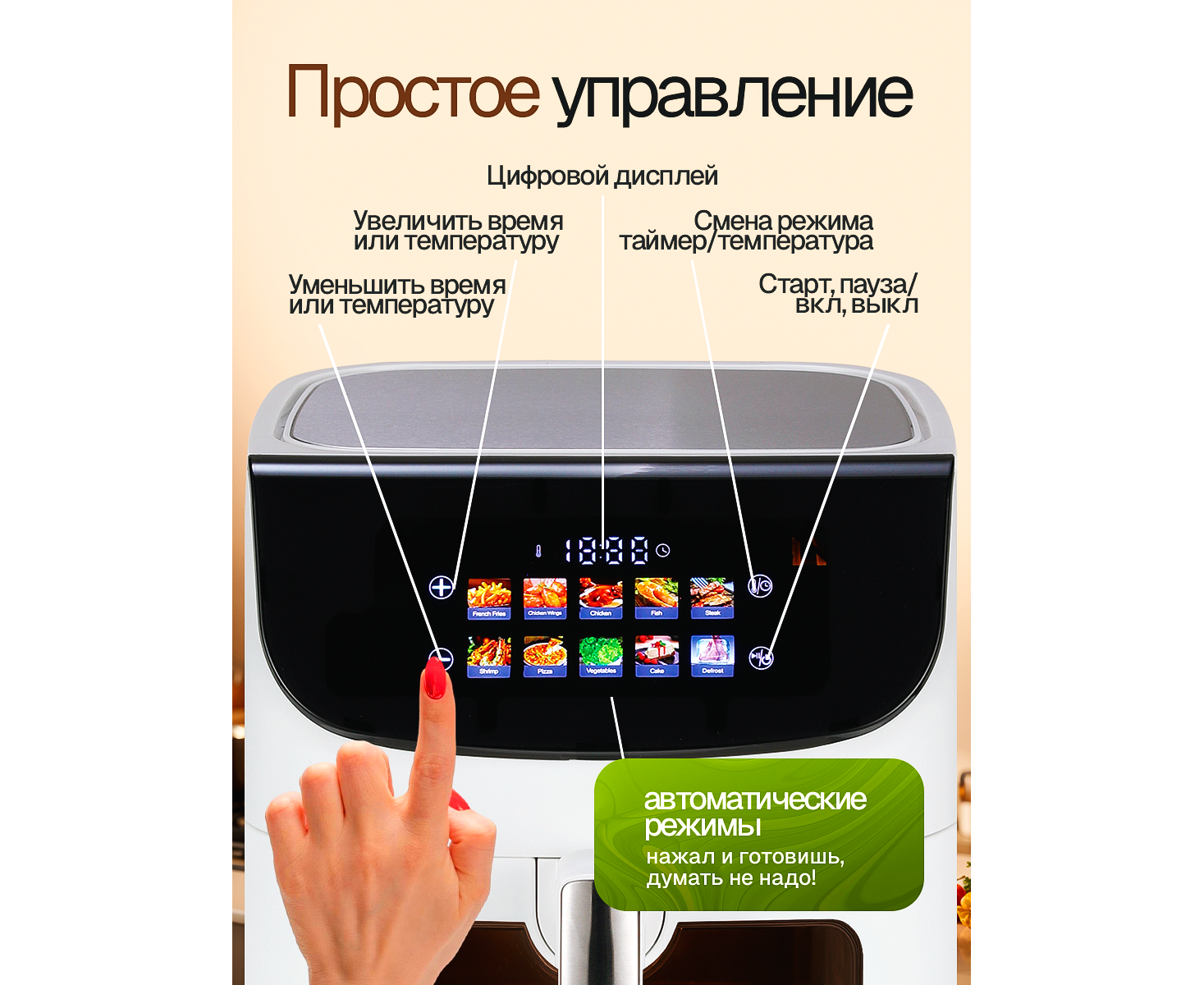 10 автоматических программ: Картофель фри, куриные крылышки, целая курица, рыба, стейк, креветки, пицца, овощи, торт, разморозка. Достаточно выбрать продукт — прибор сам установит оптимальные время и температуру.