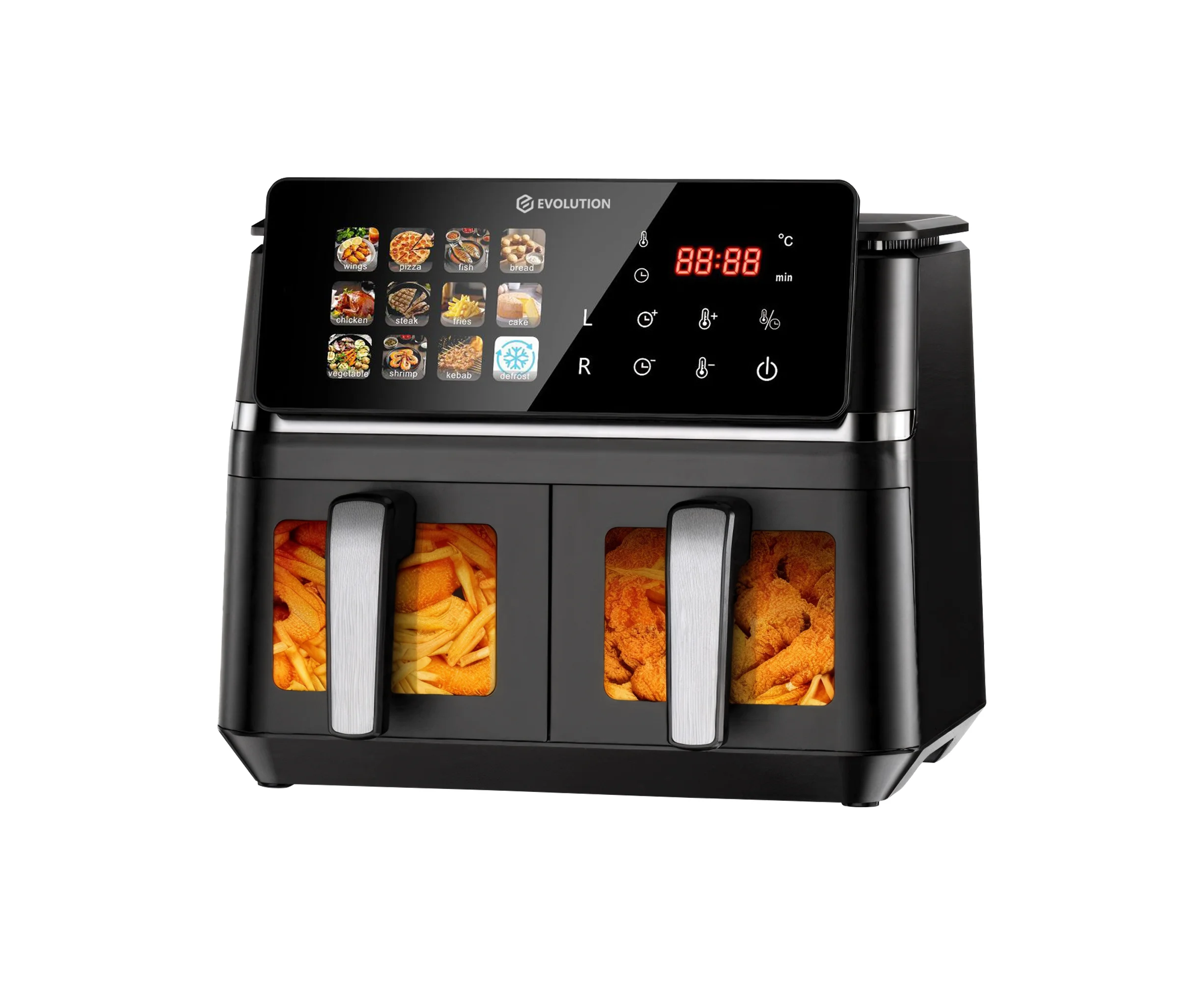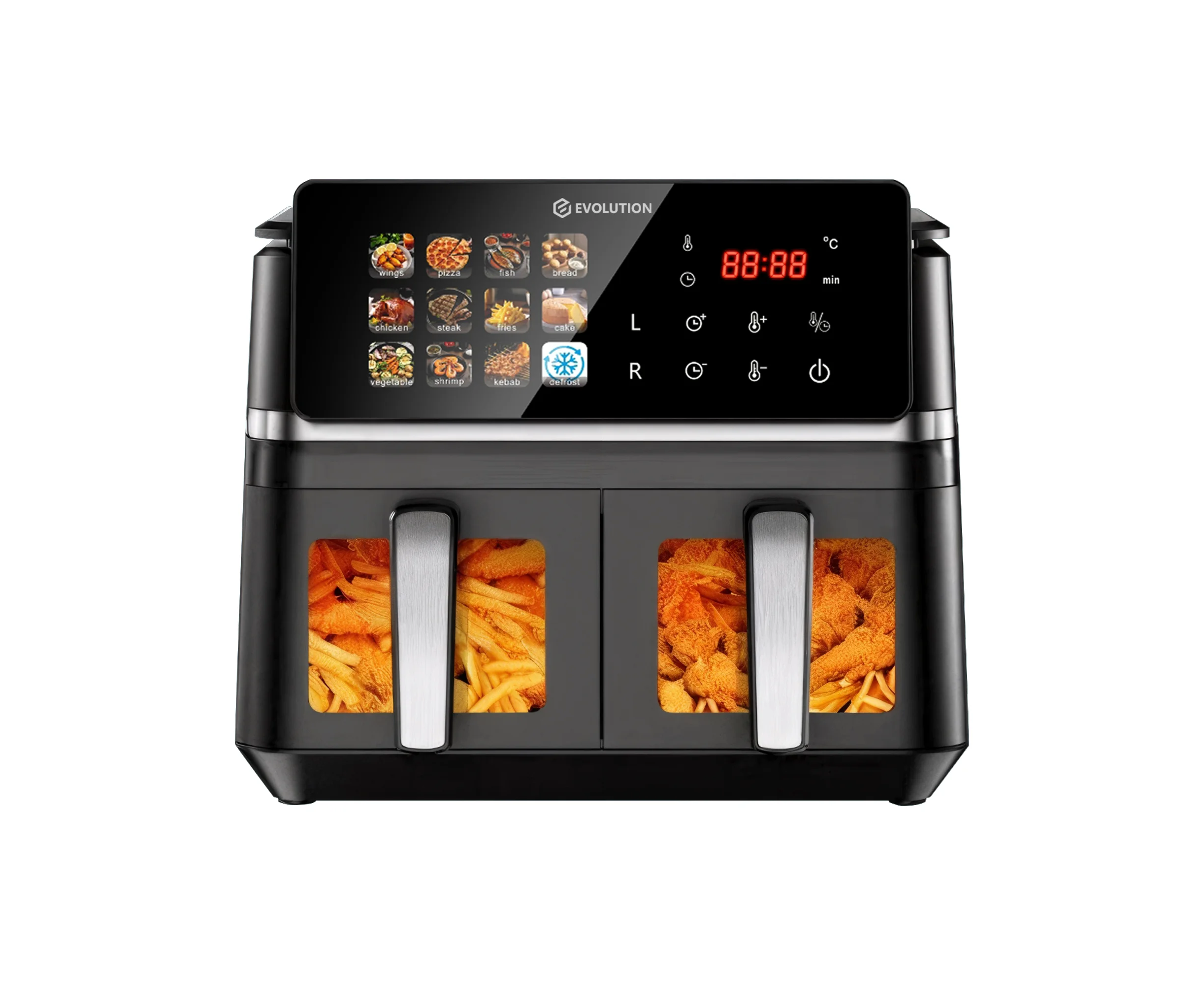 Аэрофритюрница Evolution AIRO 10500ТW Dual представляет собой высокопроизводительный аэрогриль, разработанный для профессионального и домашнего использования. Горизонтальная загрузка объемом 9 литров обеспечивает оптимальное распределение продуктов в двух независимых зонах нагрева, что значительно упрощает процесс приготовления и позволяет одновременно работать с разными ингредиентами. Прибор позволяет готовить большинство продуктов с минимальным количеством масла или вовсе без его добавления. Благодаря системе циркуляции горячего воздуха продукты обжариваются равномерно со всех сторон, получаясь при этом нежными внутри и с хрустящей корочкой снаружи.