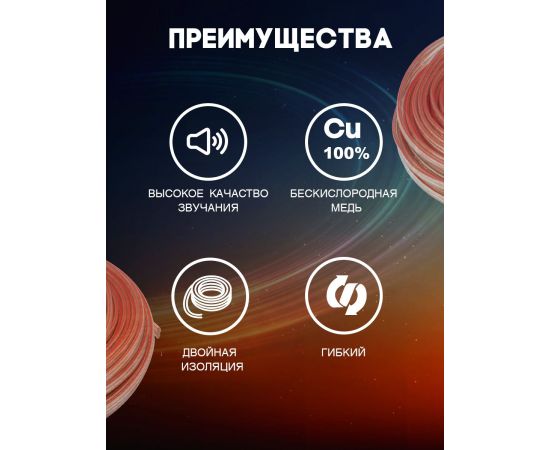 Кабель имеет две жилы сечением 0.75 мм каждая, изготовленные из меди - материала с отличными проводящими свойствами. Это позволяет обеспечить надежную и качественную передачу звука без потерь.