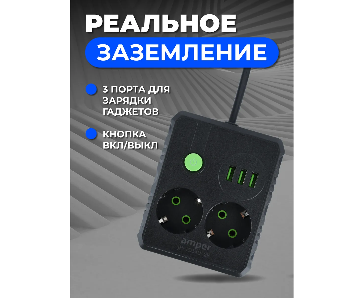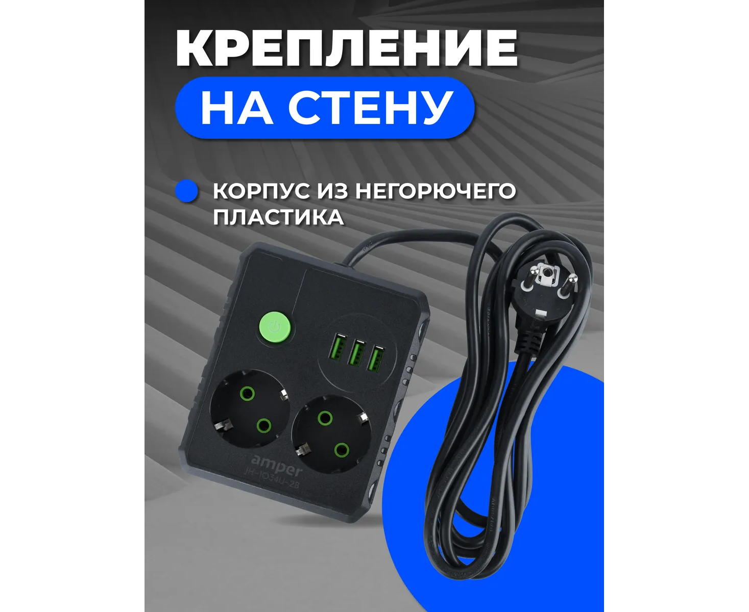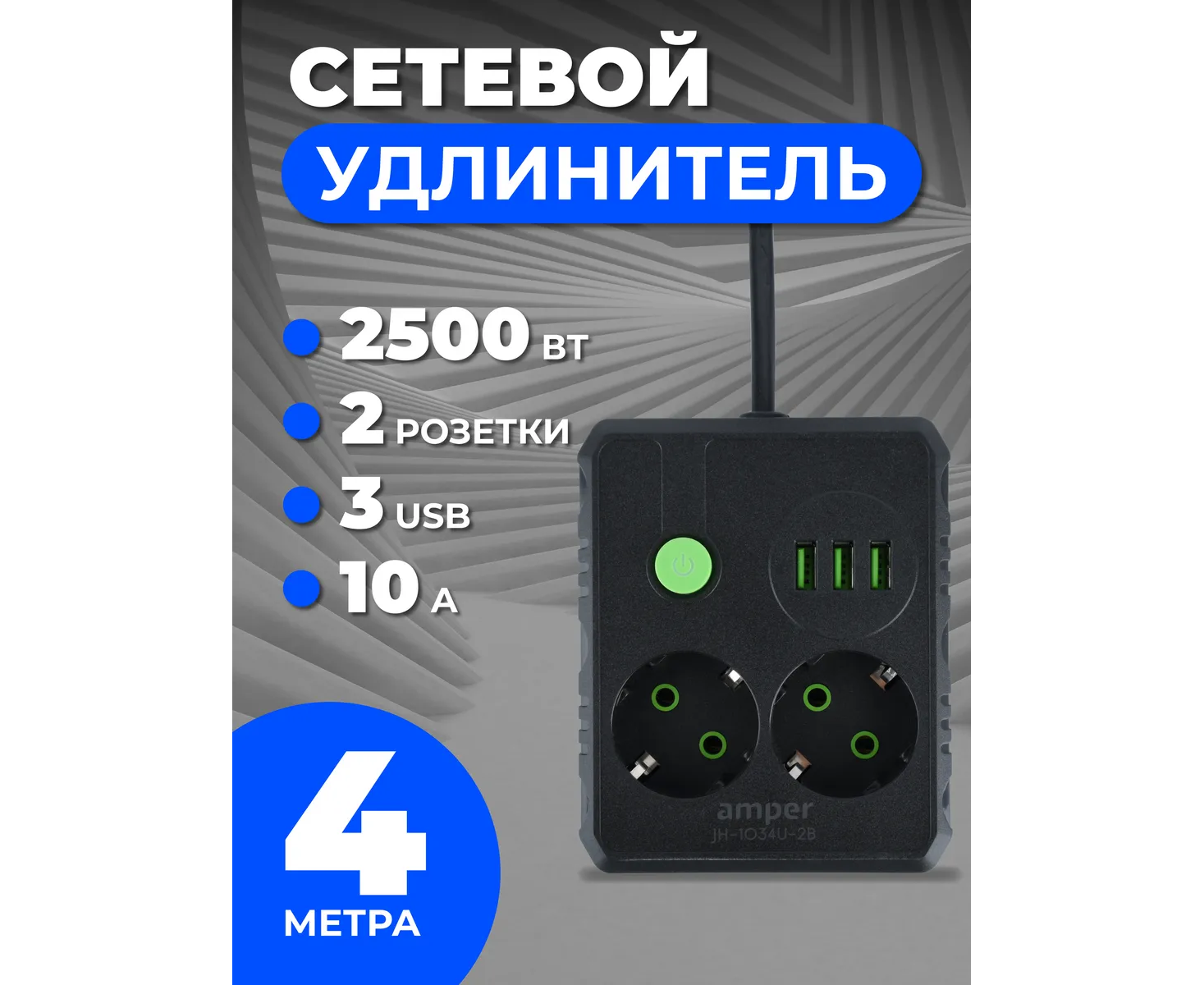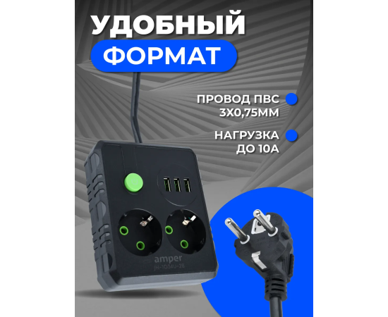 Сетевой удлинитель Amper , 4,0м, 2 розетки, 10А, 2500 Вт, 3usb, черный