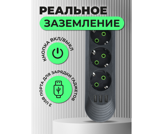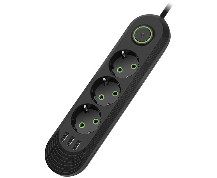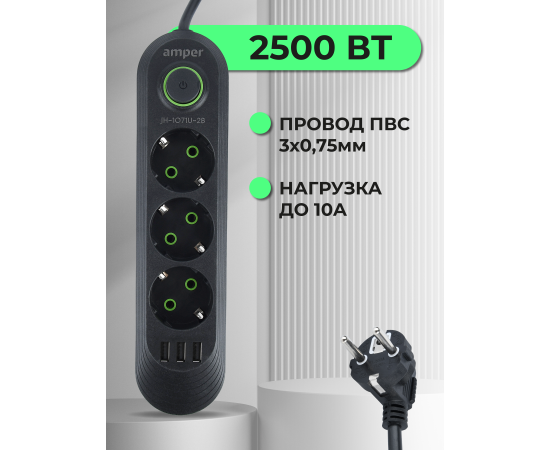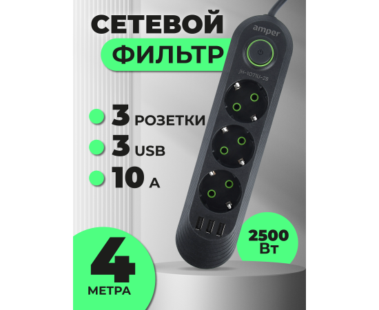 Сетевой удлинитель Amper , 4,0м, 3 розетки, 3*0,75мм, 10А, 2500 Вт, 3usb, черный