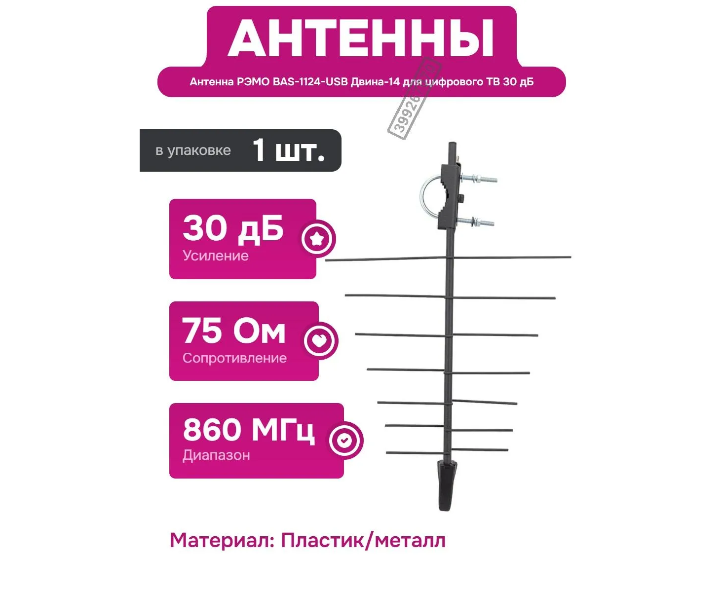 Антенна "РЭМО" BAS-1124-P ДВИНА-14, уличная, пассивная, 10 дБи, DVB-T, DVB-T2, цифровая. Антенна РЭМО ДВИНА-14 позволяет получить качественный ТВ-сигнал в местах уверенного покрытия, где не требуется усиление. Если ваш дом расположен недалеко от телевышки, но стены зданий служат преградой, воспользуйтесь устройством, чтобы обеспечить трансляцию без помех. Поместите конструкцию за окном или на металлической мачте на дачном участке и смотрите любимые передачи без искажения картинки и пропаданий звука. Особенности: предназначена для приёма аналоговых и цифровых сигналов в диапазоне ДМВ.