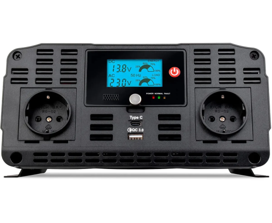 Чистая синусоида (PSW), порты Type-C и USB с QC, корпус ABS, LCD-экран, активное охлаждение, отслеживание ёмкости аккумулятора, медные контакты с огнестойкой оболочкой, крепления для фиксации инвертора, 6 предохранителей 40A, контакт заземления, звуковое предупреждение, система электрических защит