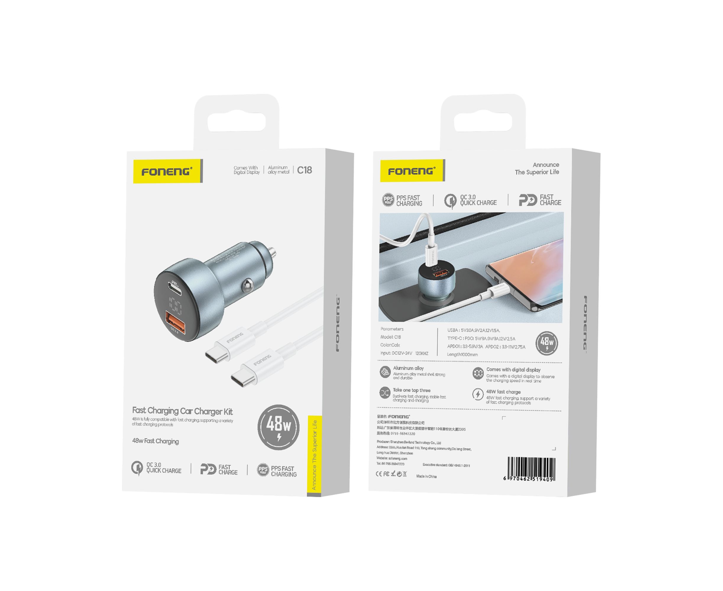 Автомобильное зарядное устройство (АЗУ) Foneng C18 USB + USB-C 48W + кабель Type-C to Type-C (Metal gray / Silver)
