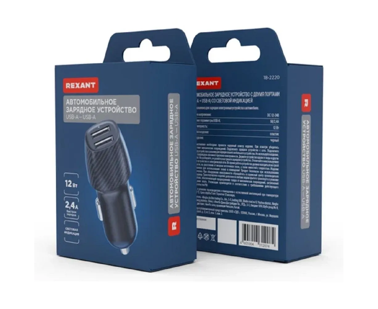 Автомобильное зарядное устройство Rexant 18-2220 c двумя портами USB-А + USB-A со световой индикацией, 12Вт, черное
