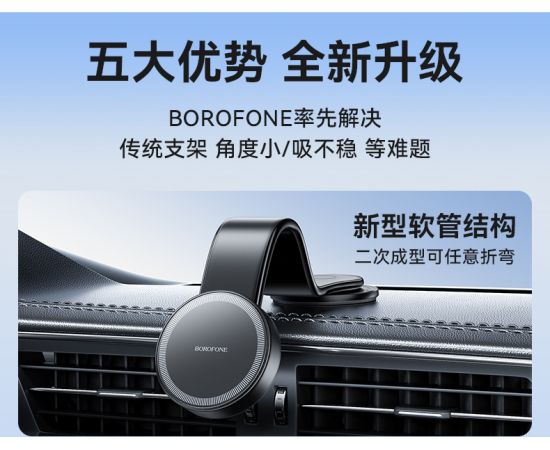 Borofone BH113 - универсальный автомобильный держатель, который буквально освободит ваши руки во время поездок. Его гибкий корпус позволяет легко регулировать угол обзора устройства на 180 градусов, обеспечивая комфортное использование в любом положении. Благодаря магнитной основе и надежному креплению на клейкой поверхности, держатель обеспечивает надежную фиксацию вашего гаджета даже на неровных дорогах.