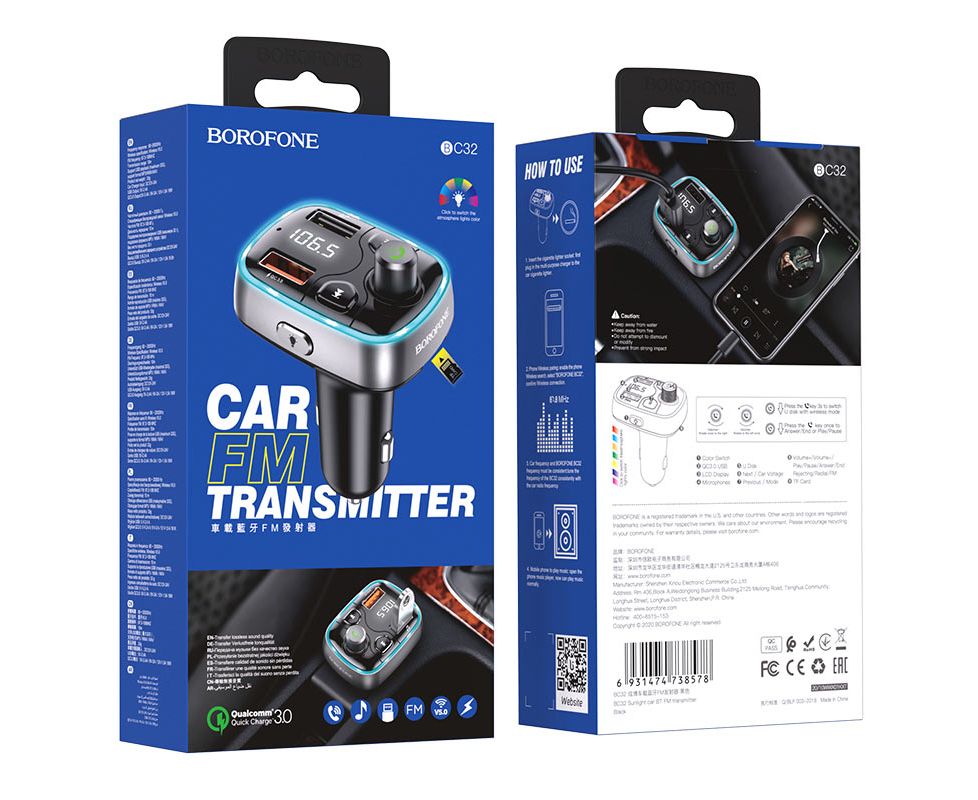 АЗУ Bluetooth FM Трансмиттер BOROFONE BC32 Sunlight (чёрный)