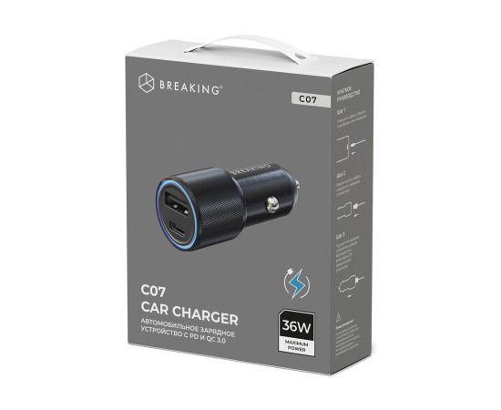Автомобильное зарядное устройство BREAKING C07 выполнено в компактном корпусе из металла. Модель рассчитана на входное напряжение 12-24V и обеспечивает выходную мощность до 36W и выходной ток до 3.4A. Два разъема USB-A и USB-C позволяют заряжать одновременно два устройства. Модель поддерживает технологию быстрой зарядки Power Delivery, Quick Charge 3.0, также поддерживает функцию защиты от перегрузок и короткого замыкания.