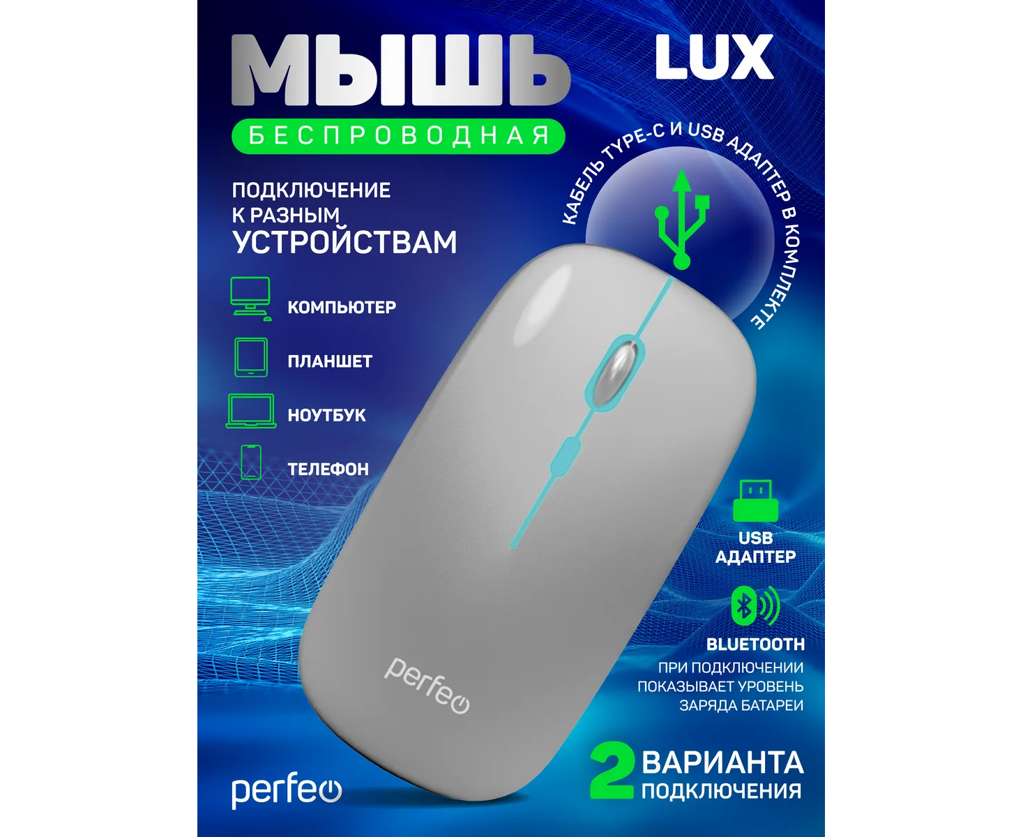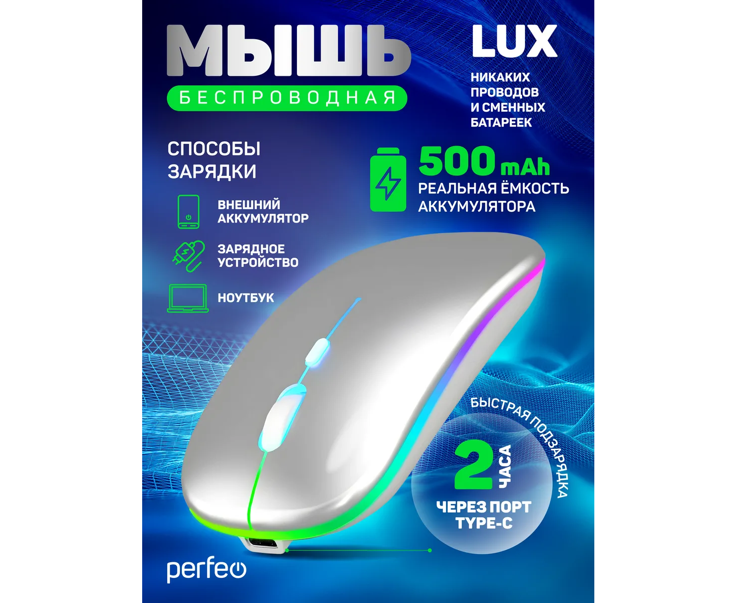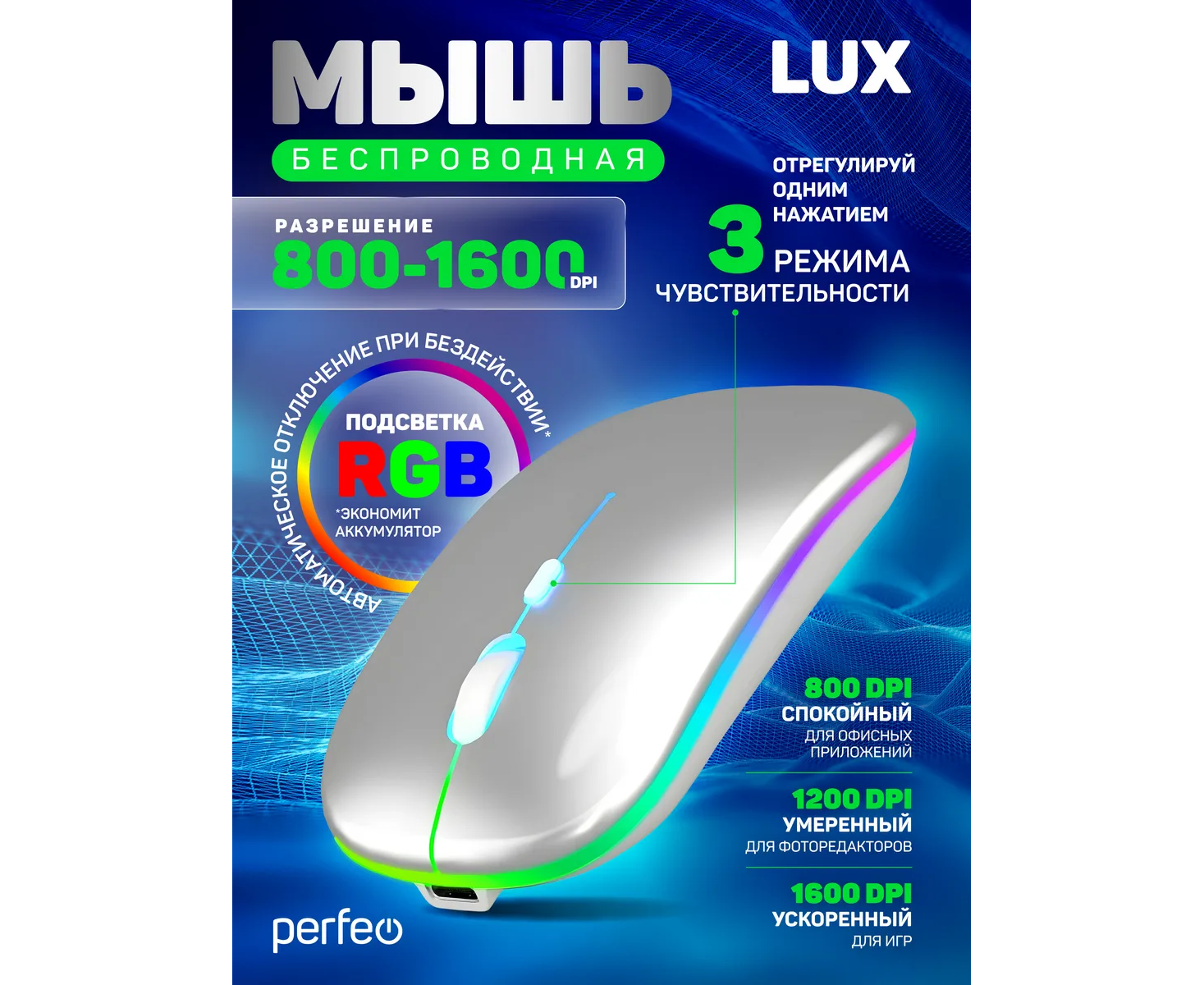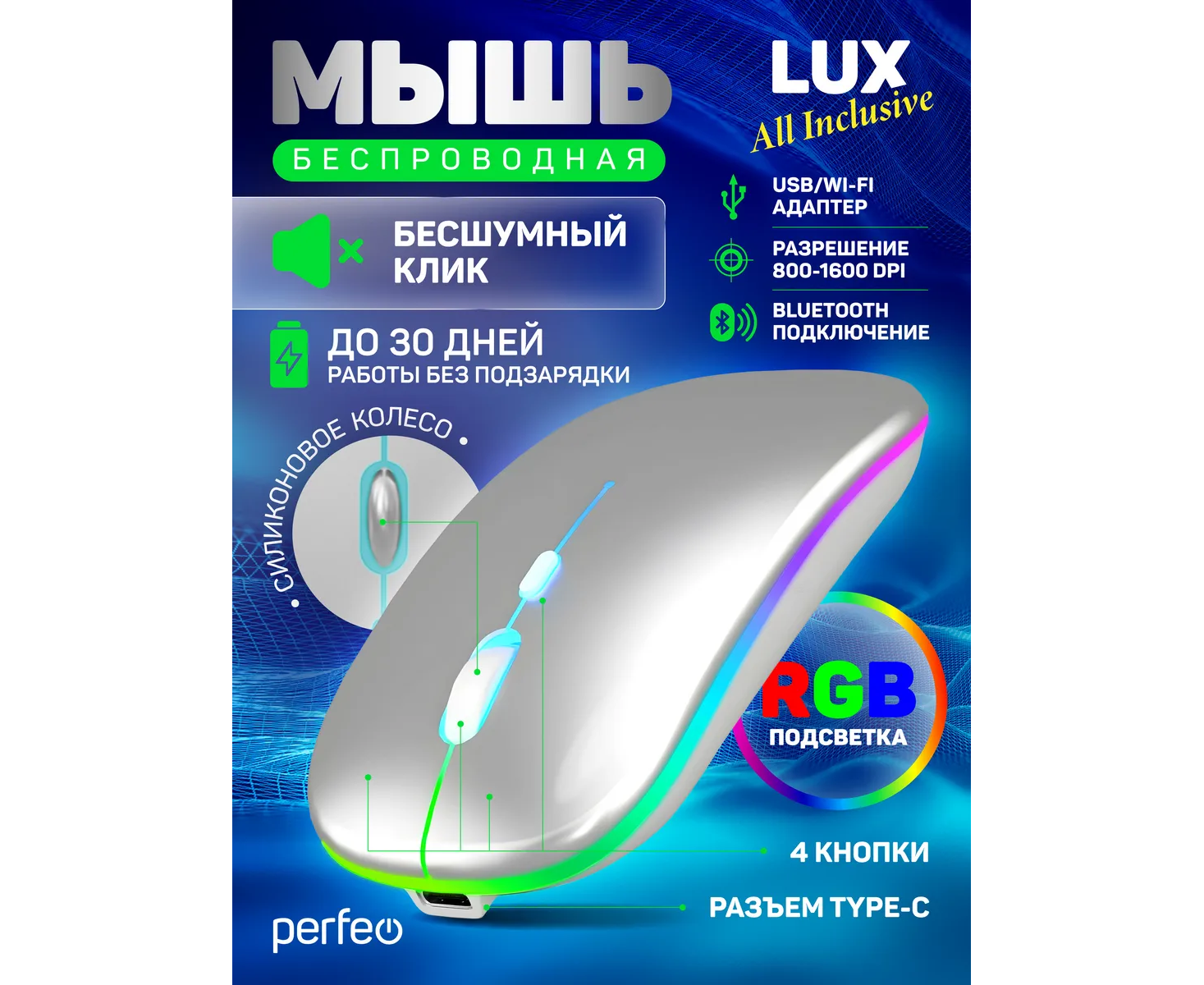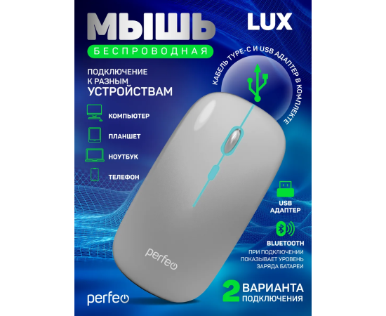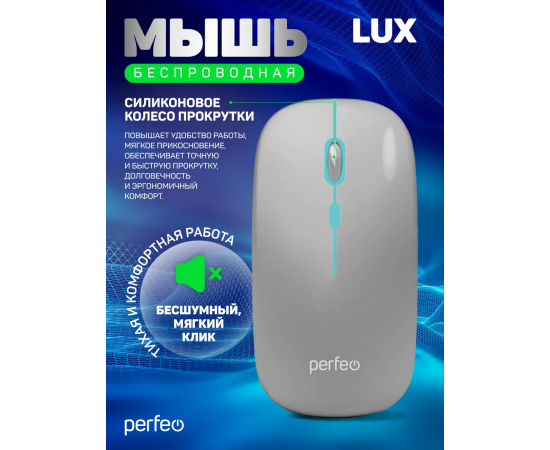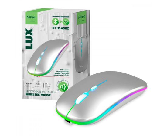 Беспроводная мышь Perfeo, оптич. "LUX", 4 кн, подкл 2.4G+BT, аккум 500mAh, type-C, подсв, бесшумн, 1600DPI, серебро