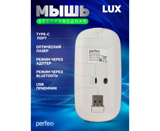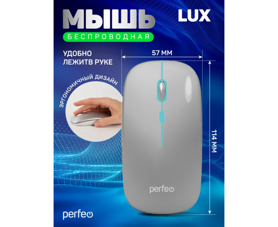Беспроводная мышь Perfeo LUX — стильное и тихое устройство для комфортной работы в офисе, дома или на ноутбуке. Оснащена высокоточным сенсором с переключаемым разрешением (800/1200/1600 DPI) и бесшумными кнопками, что делает её идеальной для использования в тихих помещениях. Поддерживает два режима подключения: радиочастотный (2.4 ГГц) и Bluetooth — обеспечивает стабильную работу на расстоянии до 10 метров. Усовершенствованная беспроводная технология гарантирует отсутствие задержек. Четыре кнопки и прорезиненное колесо прокрутки обеспечивают удобство управления. Симметричная форма подходит как для правой, так и для левой руки. Внутренняя контурная RGB-подсветка добавляет стиль. В комплект входит мини-ресивер USB и кабель Type-C для зарядки. Аккумулятор ёмкостью 500 мА·ч обеспечивает длительную автономную работу. Plug’n’Play — не требует установки дополнительного ПО.