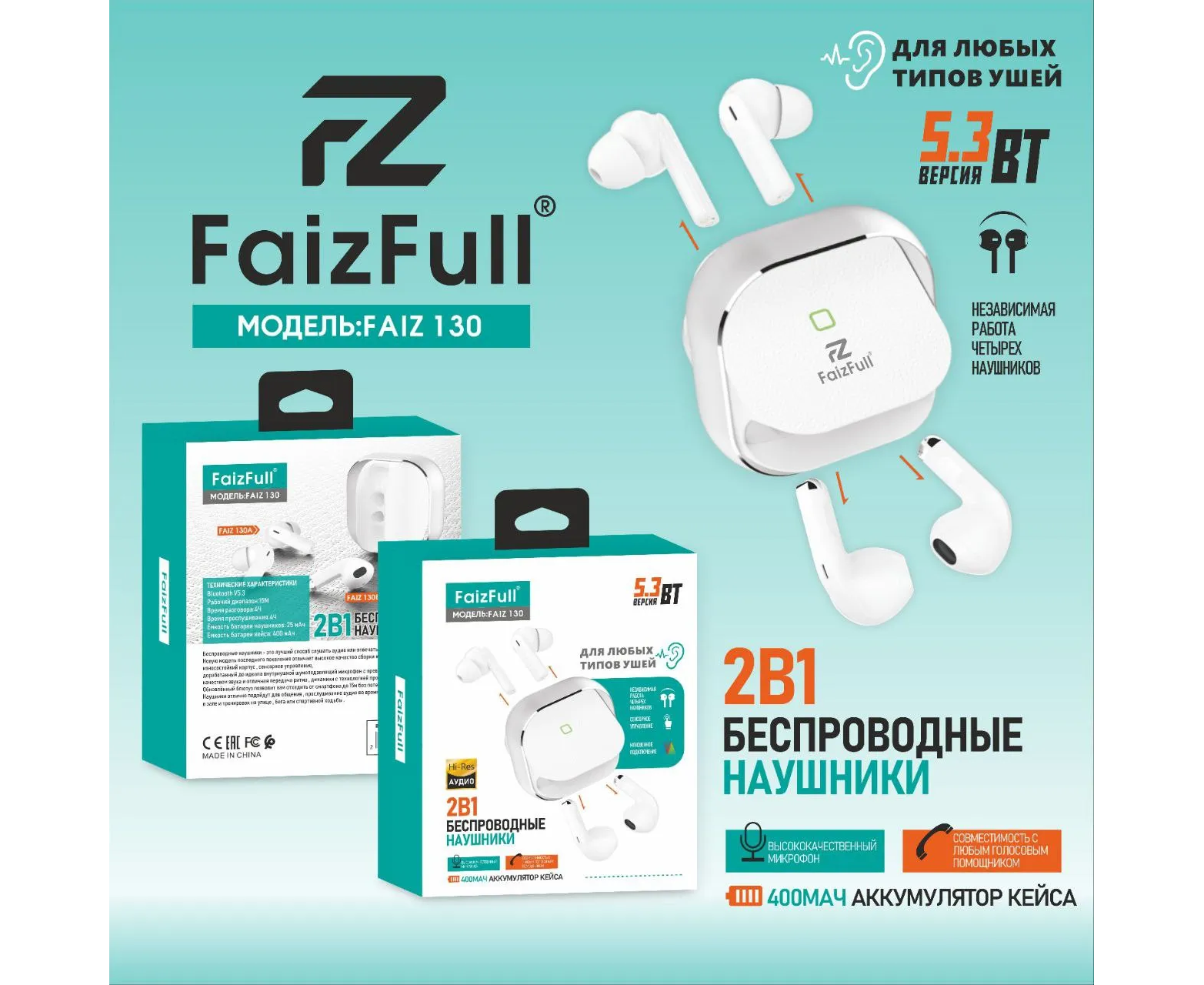 Беспроводные наушники FaizFull Faiz130 2в1 BT5.3 Белый