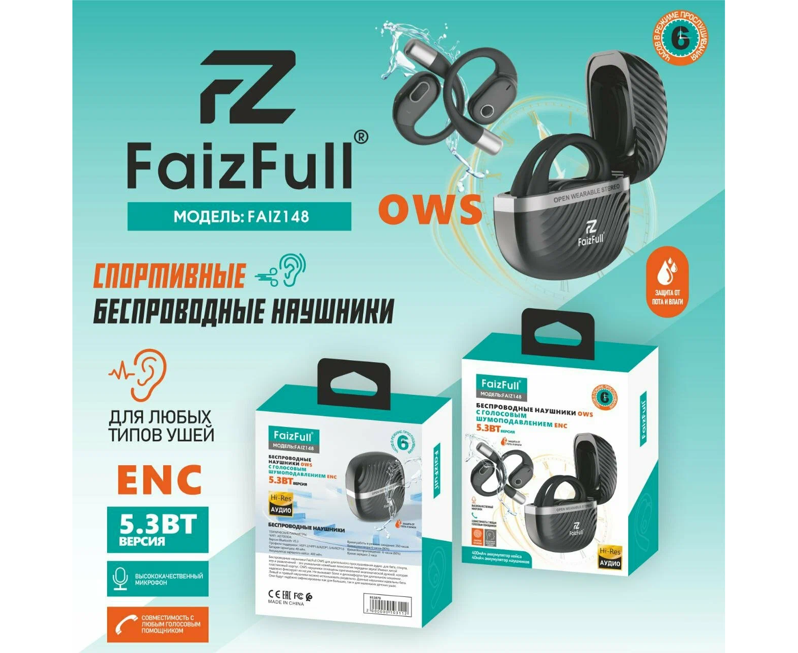 Беспроводные наушники FaizFull Faiz148 OWS+ENC IPX5 BT5.3 Black