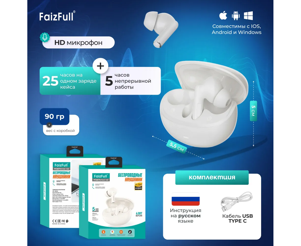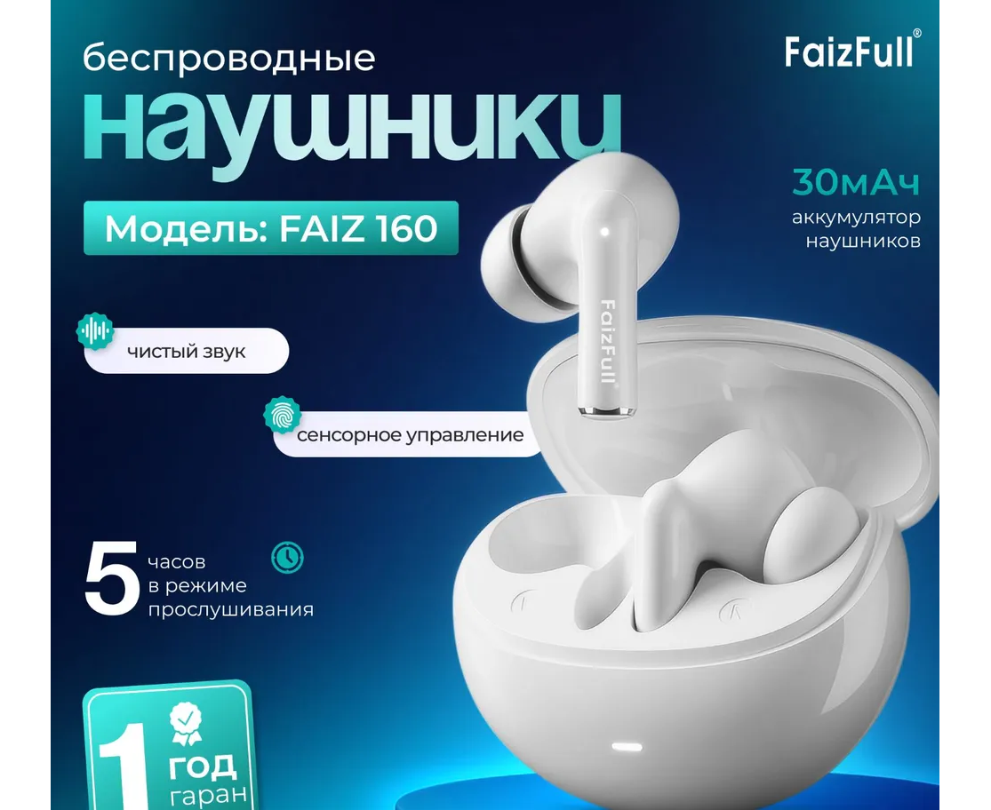 Беспроводные наушники FaizFull Faiz160 White HD микрофон, Совместимы с IOS, Android, Windows