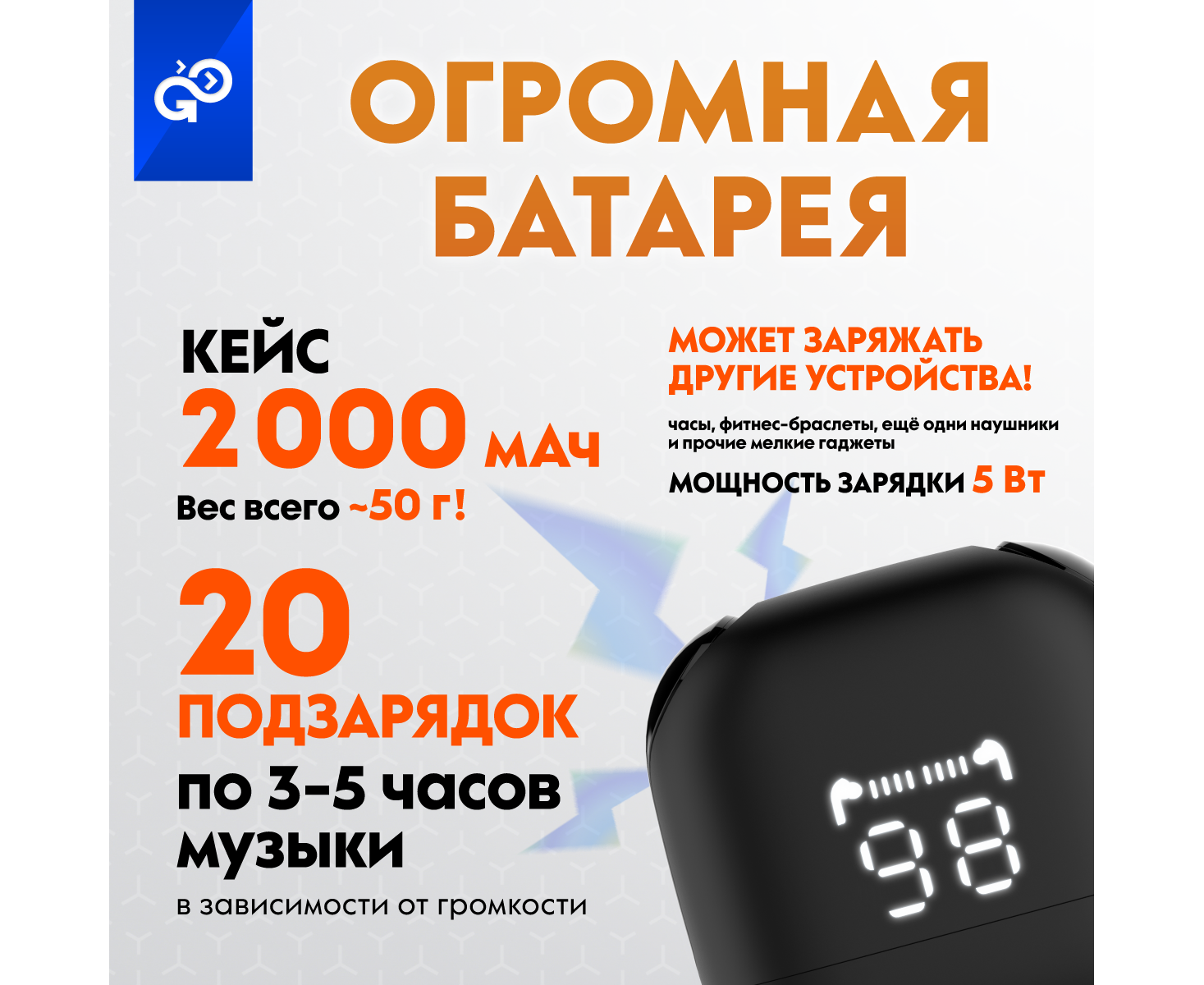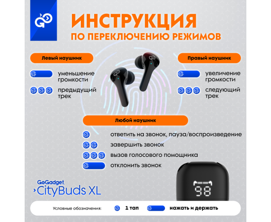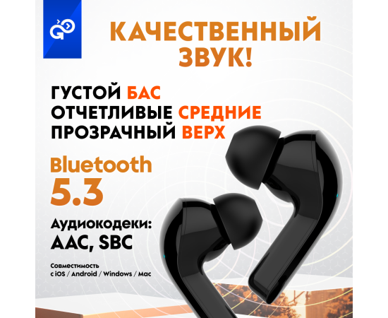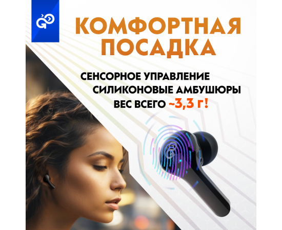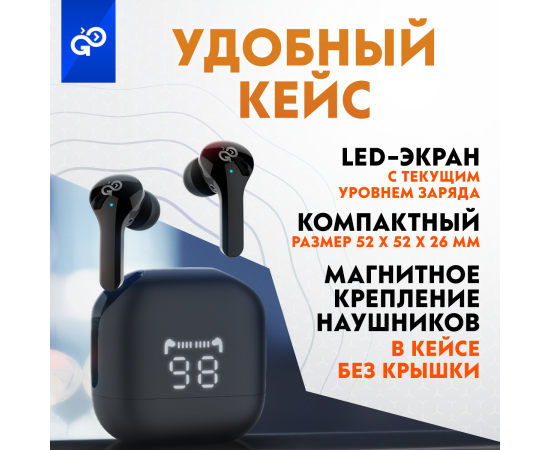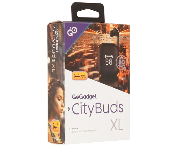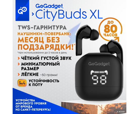 Беспроводные наушники GoGadget CityBuds XL, вакуумные, 2 микрофона, 40+2000 мАч, до 80 ч, ЧЕРНЫЙ