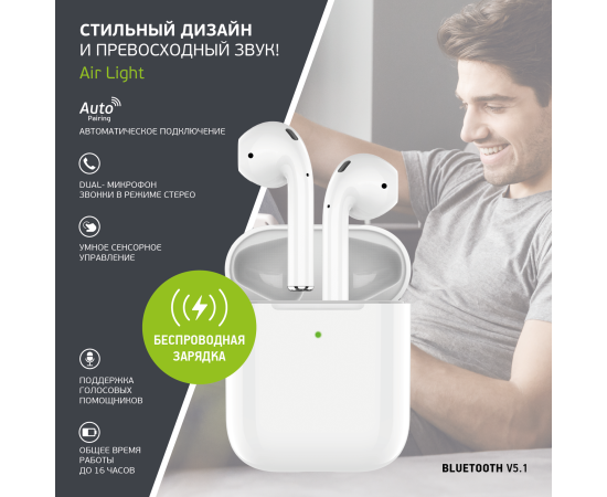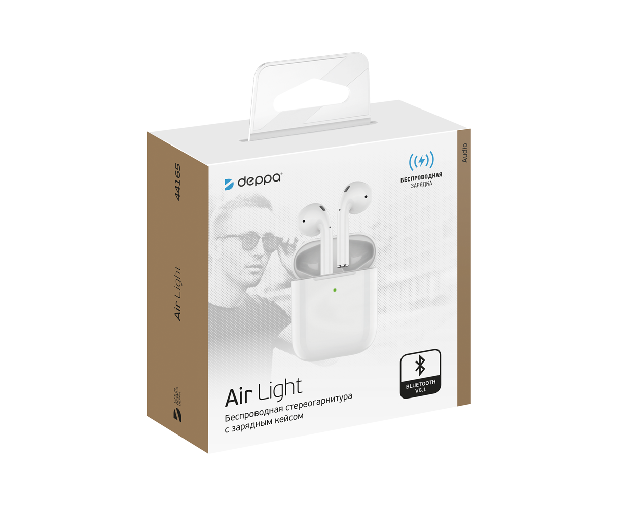 Беспроводные наушники с микрофоном Air Light, TWS, BT 5.3, 300 мАч, QI, белый, Deppa 44165