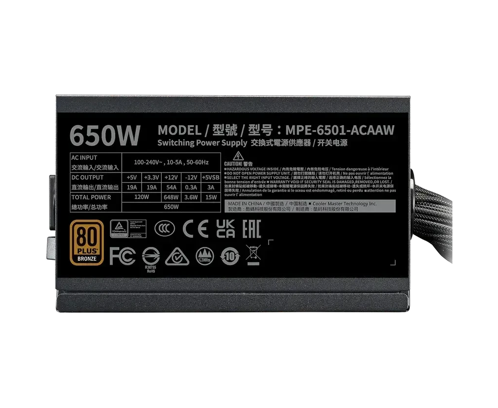 Блок питания Cooler Master MWE Bronze V3 Gen.5 (MPE-6501-ACAAW-3BEU), 650Вт, 80 Plus Bronze, 120мм, retail