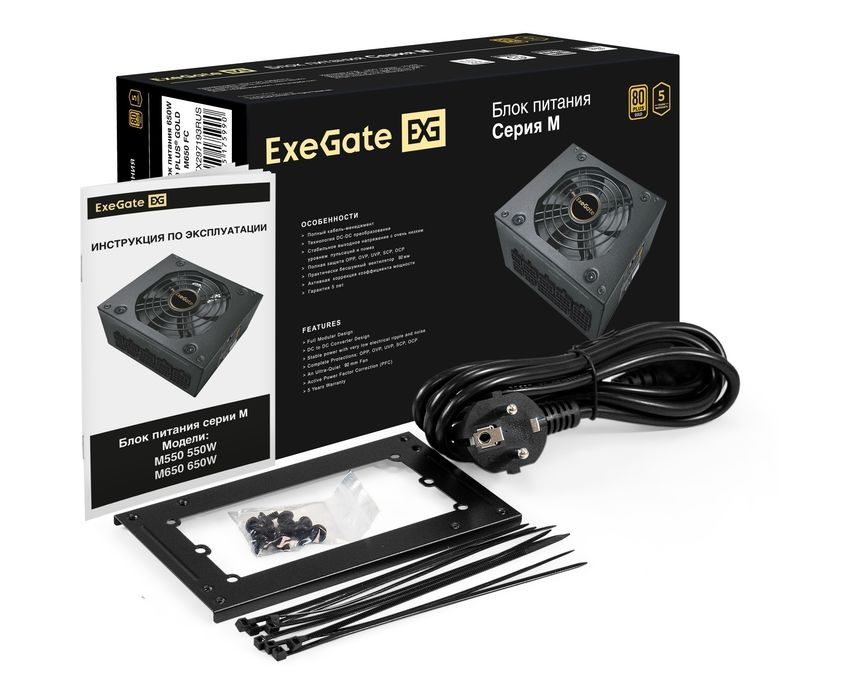 Блок питания Exegate M650 Gold EX297193RUS 650W (SFX, APFC, КПД 90проц. (80 Plus Gold), 9cm fan, 24pin, (4+4)pin, 2xPCI-E, 6xSATA, 3xIDE, 1xFDD)