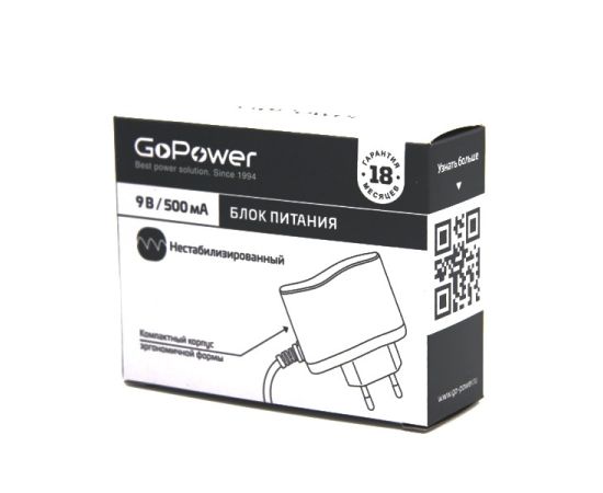 Блок питания GoPower 500mA 9V 5,5x2,1/12мм нестабилизированный отрицательная полярность (1/100)