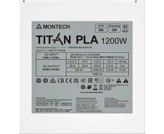 Блок питания Montech Titan PLA 1200W (TIX0126) / ATX 3.1, APFC, 80 Plus Platinum, Japan caps, 135mm fan, full modular