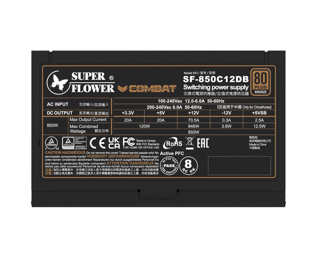 Блок питания Super Flower Combat DB (SF-850C12DB) 850W ATX3.1 ATX 3.1, 120mm, 8xSATA, 4xPCI-E(6+2), 1xPCI-E 16, APFC, 80+ Bronze,