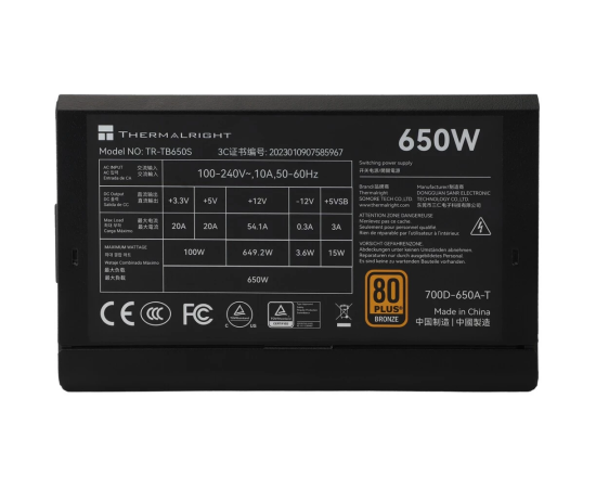 Блок питания Thermalright TR-TB650S 650W 80+ Bronze (ATX, 3, Non-modular, 1x24(20+4)pin 550mm, 1xCPU*2 8(4+4)pin 600+150mm, 1xPCIe*2 8(6+2)pin)