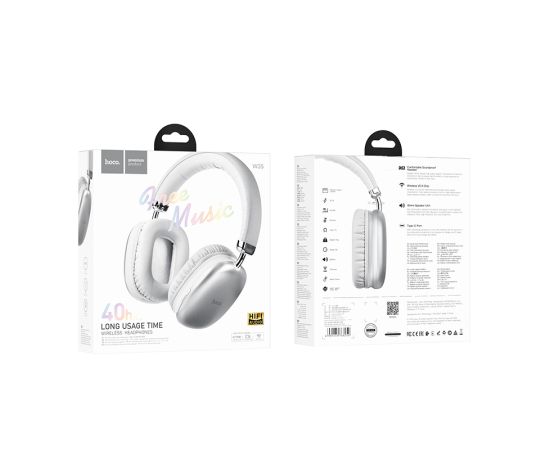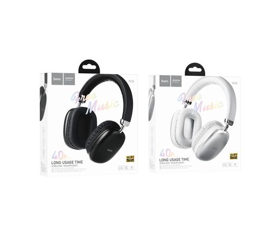 Hoco W35 — стильные беспроводные полноразмерные наушники для использования с ТВ, аудио, видео техникой, компьютером, телефоном или ноутбуком, обеспечивают беспроводную связь через версию Bluetooth 5.3. Наушники оснащены удобными, мягкими амбушюрами, в которых не чувствуется дискомфорт даже при длительном использовании. Гарнитура оснащена слотом для карты памяти, что дает возможность сделать из наушников аудиоплеер mp3. Устройство имеет энергоемкий аккумулятор, время работы в режиме использования составляет 40 часов, в режиме ожидания до 200 часов. Полная зарядка батареи займет два часа.
