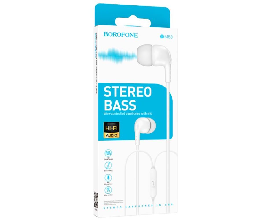 Гарнитура внутриканальная Borofone BM83 - универсальные наушники с микрофоном, аудио штекером 3.5мм и кабелем длиной 1.2м.