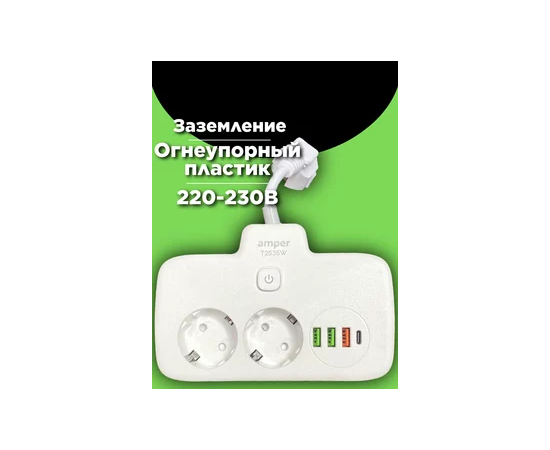 Cетевой удлинитель Amper 0,2м, 2 розетки, 3*0,75мм, 10А, 2500 Вт, 3usb, 1Type-C, 1кн, белый.
