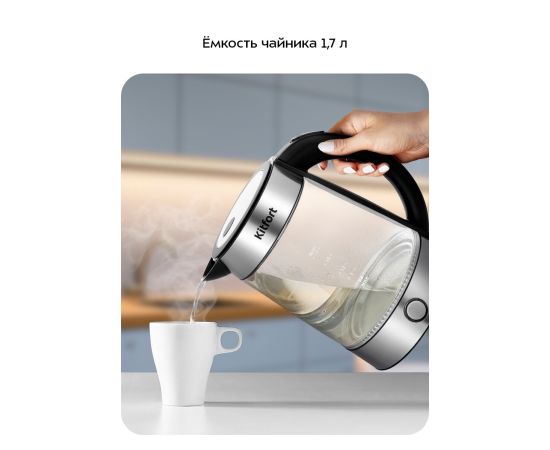 Центральный контакт для чайника на базе дает возможность ставить его на базу в любом положении, обеспечивая вращение на 360°, а эргономичный корпус впишется в любой интерьер. Полный чайник закипает за 5—7 минут.