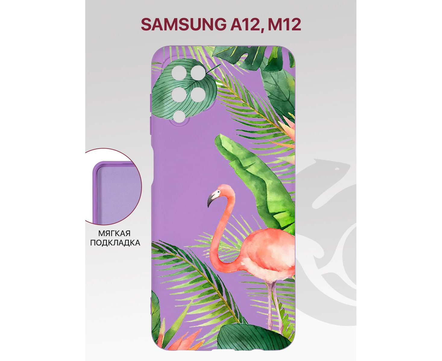Чехол для Samsung Galaxy A12 (A125 A127), Samsung M12 с рисунком, с защитой камеры, с мягкой подкладкой из микрофибры противоударный, сиренево-лиловый с принтом ФЛАМИНГО, Самсунг Галакси А12 М12