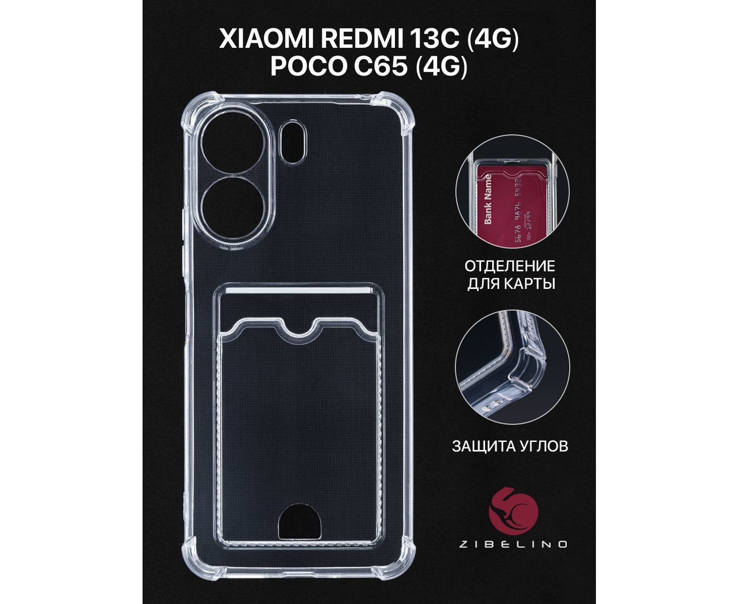 Чехол накладка силиконовый Card Holder для Xiaomi Redmi 13C (4g), Poco C65 (4g) с карманом, с картхолдером, прозрачный (Ксиоми Редми 13С, Поко С65)