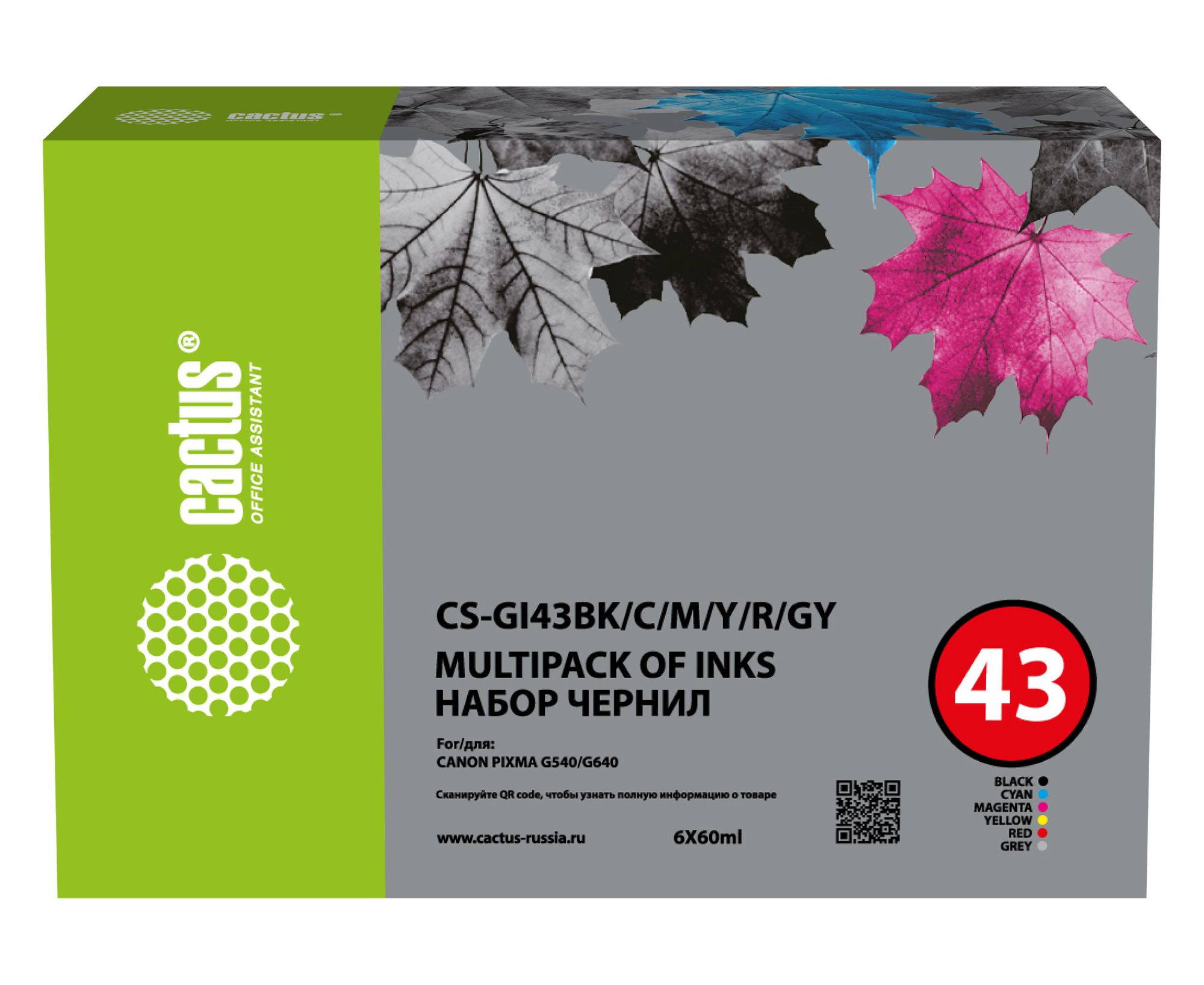 Чернила Cactus CS-GI43BK/C/M/Y/R/GY голубой/пурпурный/желтый/черный 6x60мл для Canon Pixma G640/G540