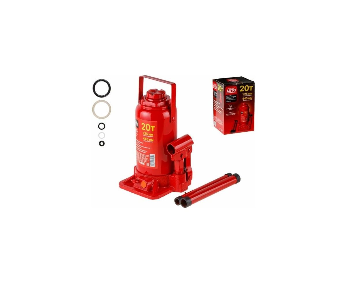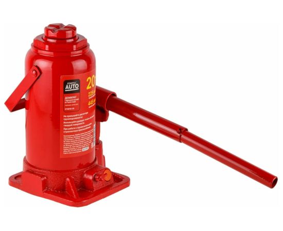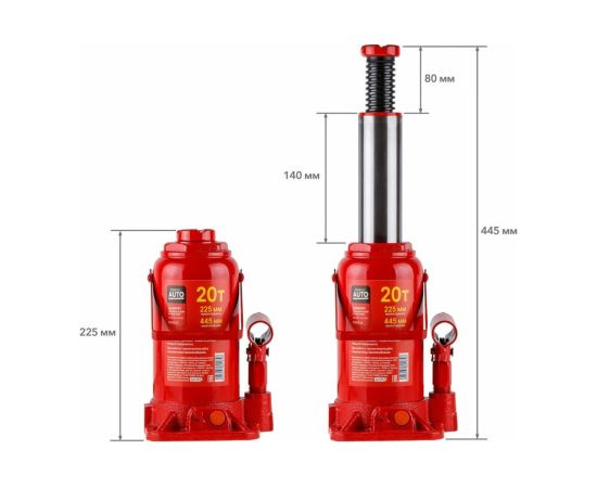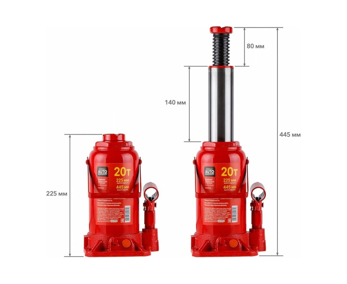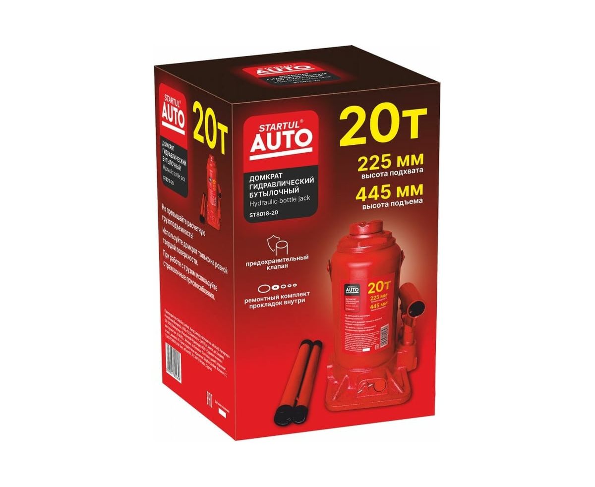 Гидравлический бутылочный домкрат STARTUL Auto 20 т ST8018-20 представляет собой устройство с ручным приводом, предназначенное для поднятия и фиксации грузов. Домкраты данного типа могут использоваться в качестве рабочего элемента в более сложных устройствах, таких как прессы, трубогибы, подъемники. Домкраты оснащены специальным предохранительным клапаном, обеспечивающим защиту от перегрузки и не позволяющим поднятия веса более допустимого.