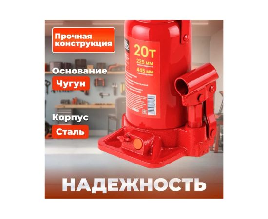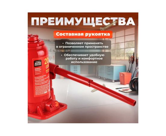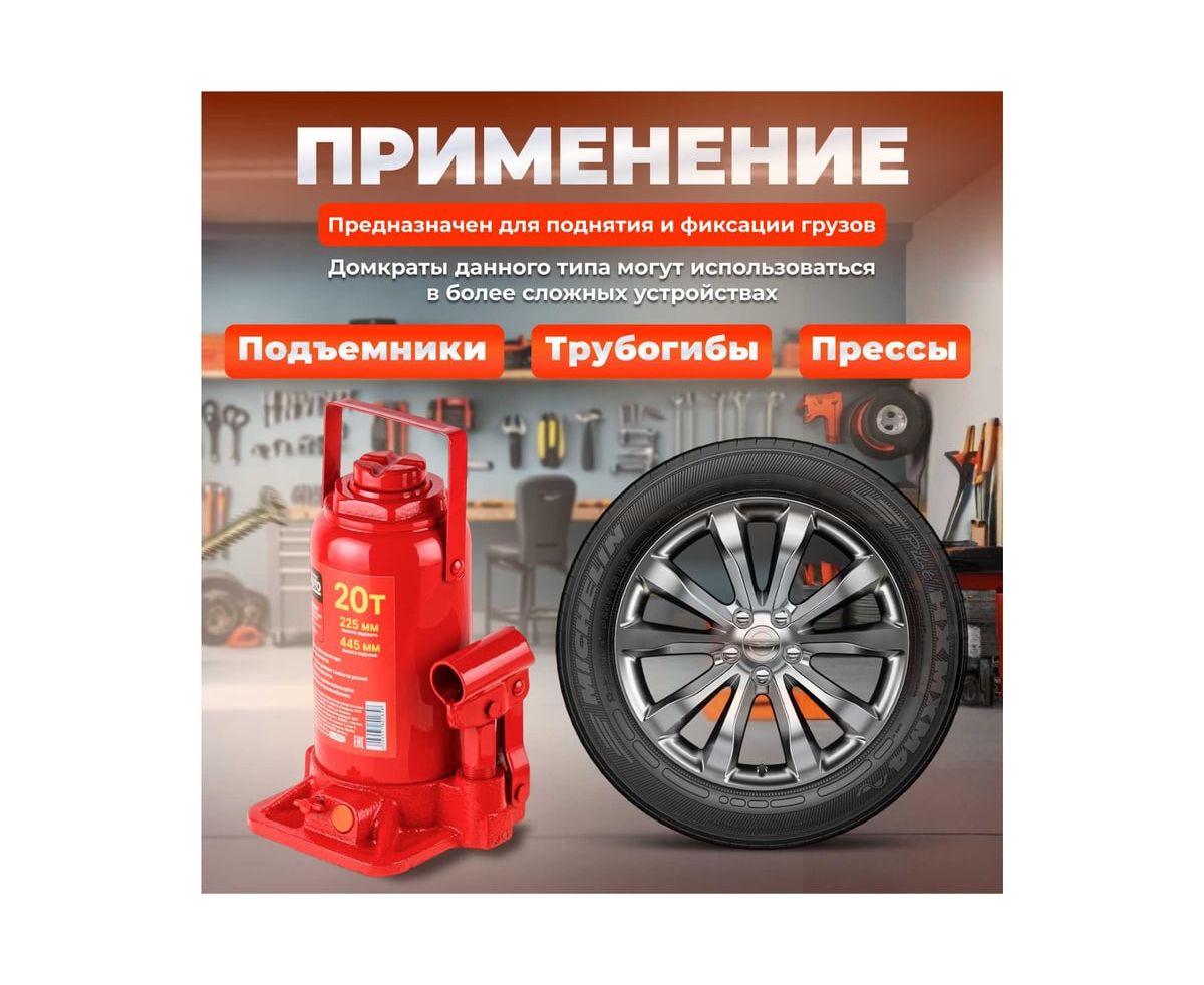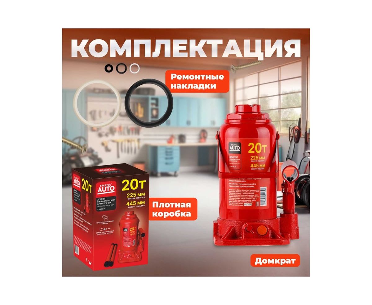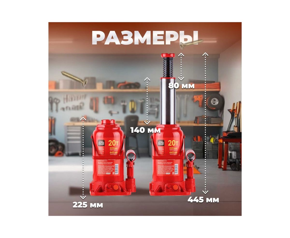 Гидравлический бутылочный домкрат STARTUL Auto 20 т ST8018-20 представляет собой устройство с ручным приводом, предназначенное для поднятия и фиксации грузов. Домкраты данного типа могут использоваться в качестве рабочего элемента в более сложных устройствах, таких как прессы, трубогибы, подъемники. Домкраты оснащены специальным предохранительным клапаном, обеспечивающим защиту от перегрузки и не позволяющим поднятия веса более допустимого.