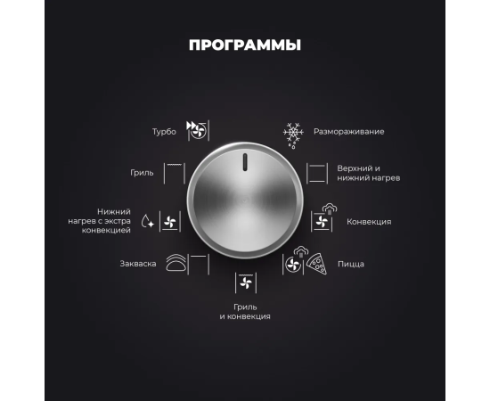 Режимы работы: Конвекция, Гриль, Размораживание, Турбо режим, Нижний нагрев, Верхний нагрев + конвекция, Нижний нагрев + конвекция, Гриль + конвекция, Нижний нагрев + Турбо (Пицца)