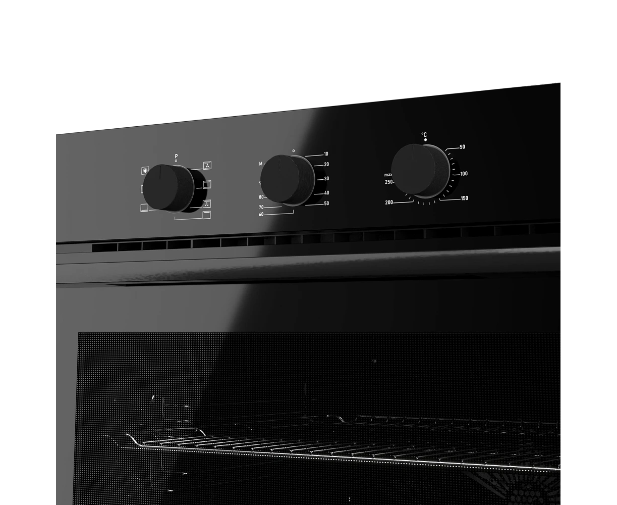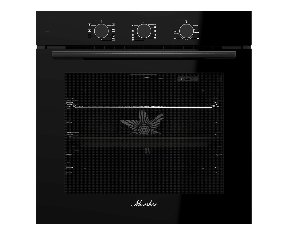 Духовой шкаф MONSHER MOE 6007 Noir 60см, объем 80л, утапливаемые переключатели, механический таймер, 2 стекла в дверце, энергоэффективность А