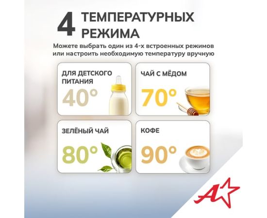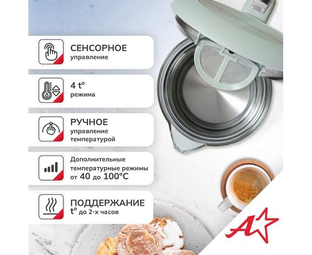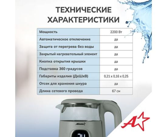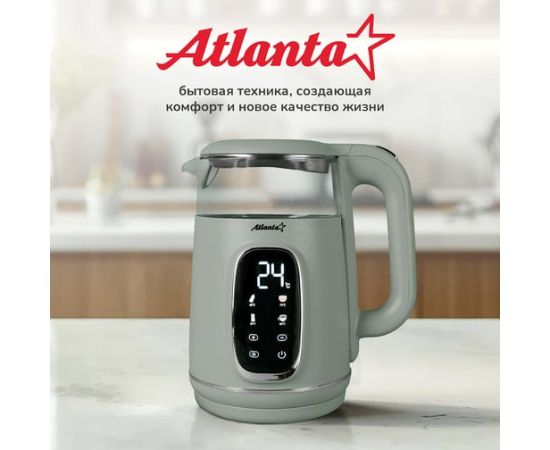 Электрический чайник Atlanta — это стильный и функциональный прибор, который станет незаменимым помощником на вашей кухне. Двойные стенки чайника обеспечивают эффективное сохранение тепла, а вращение на подставке на 360° гарантирует удобство использования. Вы можете выбрать одну из четырех температурных настроек, чтобы приготовить идеальный напиток для любого случая. Корпус из нержавеющей стали и пластика придает чайнику прочность и элегантный внешний вид. Удобное управление делает процесс использования простым и интуитивно понятным.