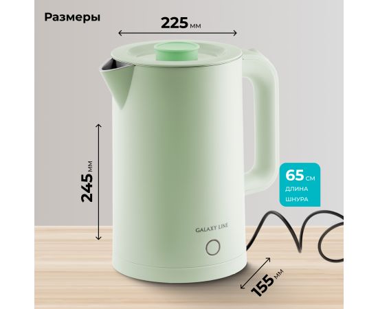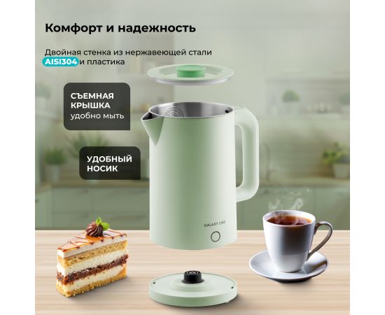 Электрический чайник GALAXY LINE GL0362 в фисташковом цвете – это сочетание высокой мощности, стильного дизайна и безопасного использования. Этот чайник мощностью 2200 Вт быстро нагреет воду для вашего утреннего чая или кофе. Объём 1,7 литра идеально подходит для большой семьи или компании гостей.