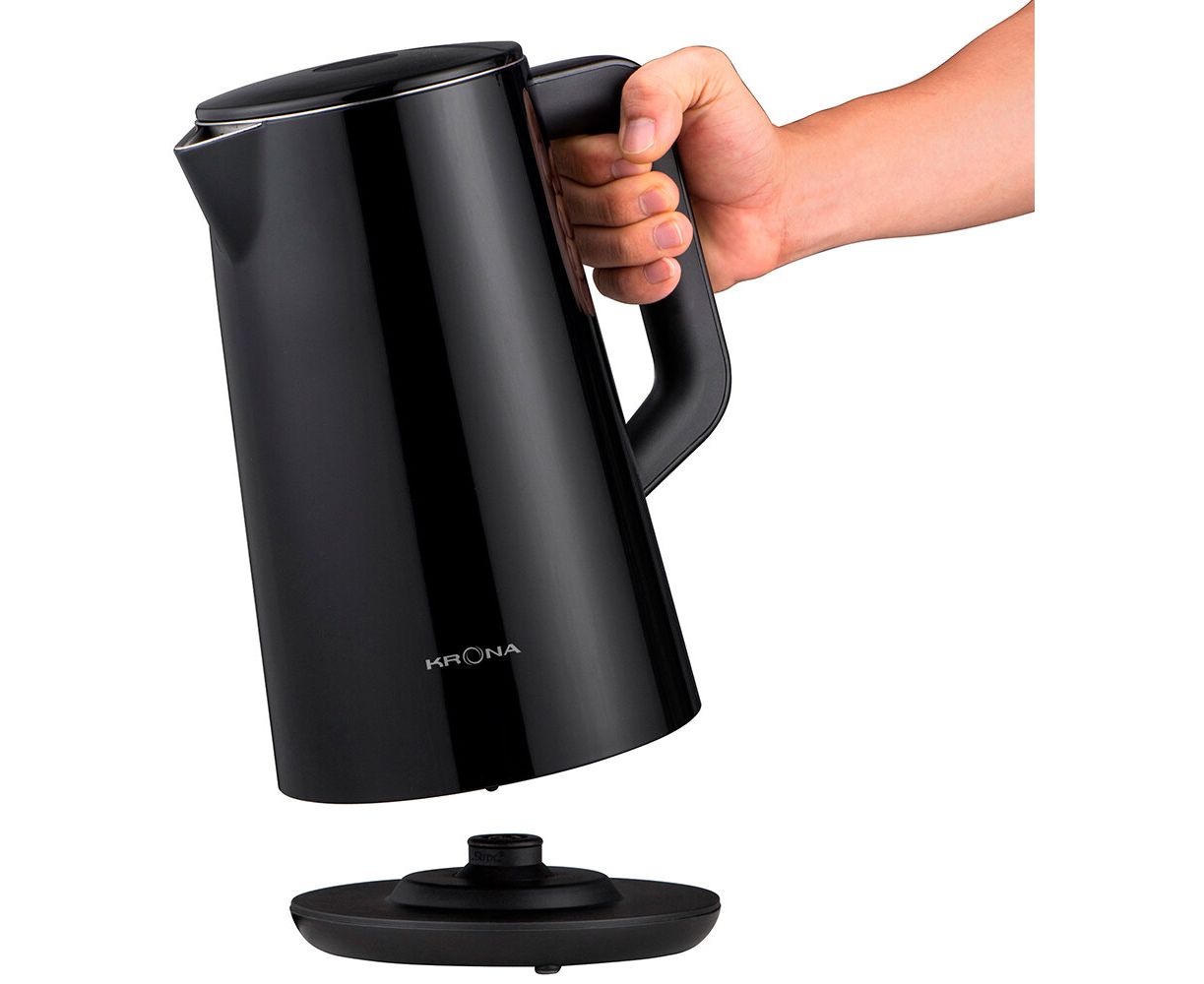 KRONA Digitaler Black - этот стильный и современный электрочайник сочетает в себе все преимущества инновационных технологий и надежной функциональности. Цифровое сенсорное управление предоставляет полный контроль над процессом нагрева. LED дисплей вровень с корпусом информирует о текущей температуре воды, а двойные стенки корпуса сохраняют тепло дольше. Емкость 1,5 литра идеально подходит для домашнего использования. Чайник оснащен гибкой регулировкой температурного режима от 40°C до 100°C, что позволяет выбрать оптимальный режим нагрева для различных напитков. Тройная защита предотвращает сухое кипячение, чайник отключается при снятии и автоматически выключается при закипании. Встроенный фильтр защиты от пыли и накипи, сохраняет воду чистой