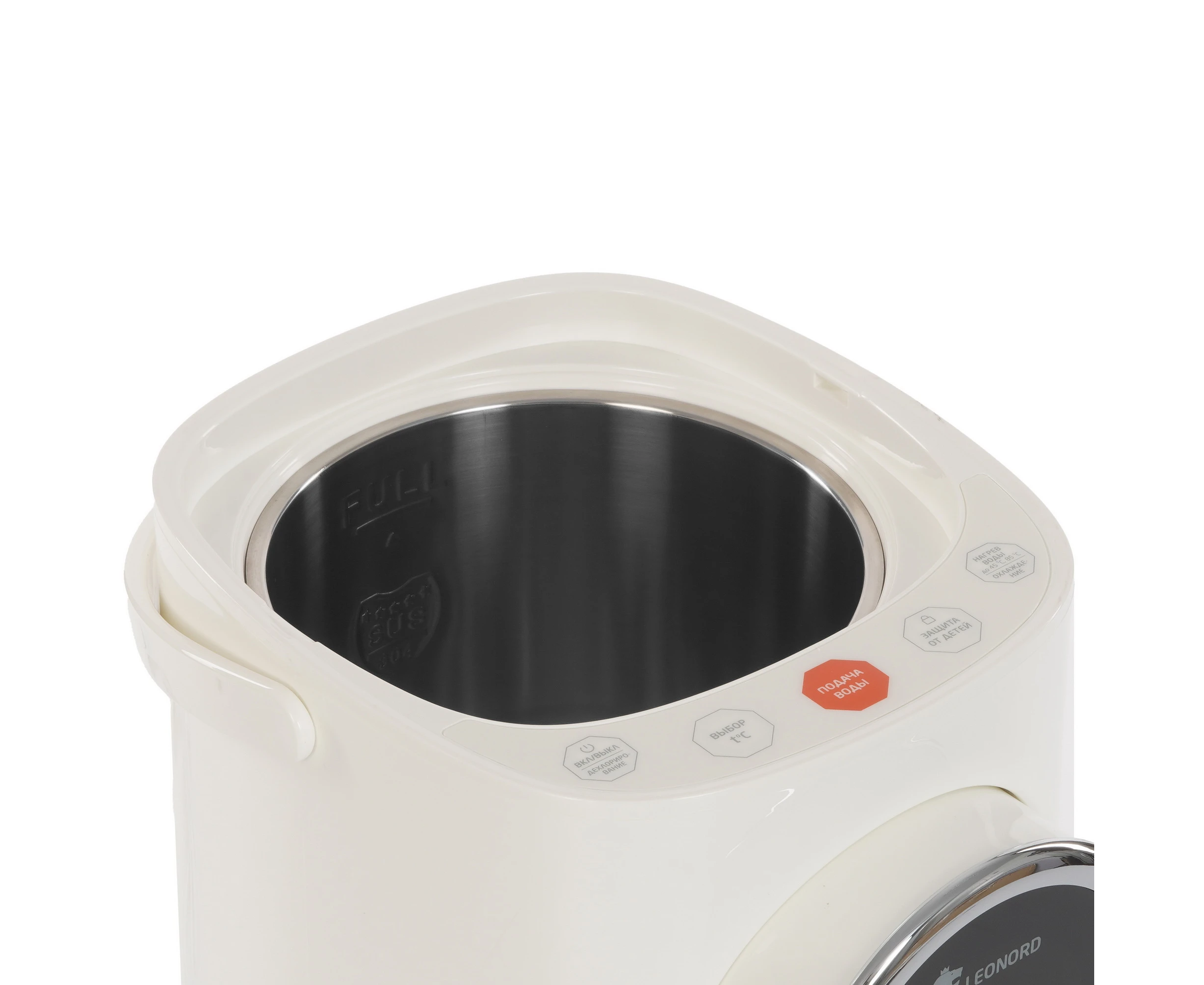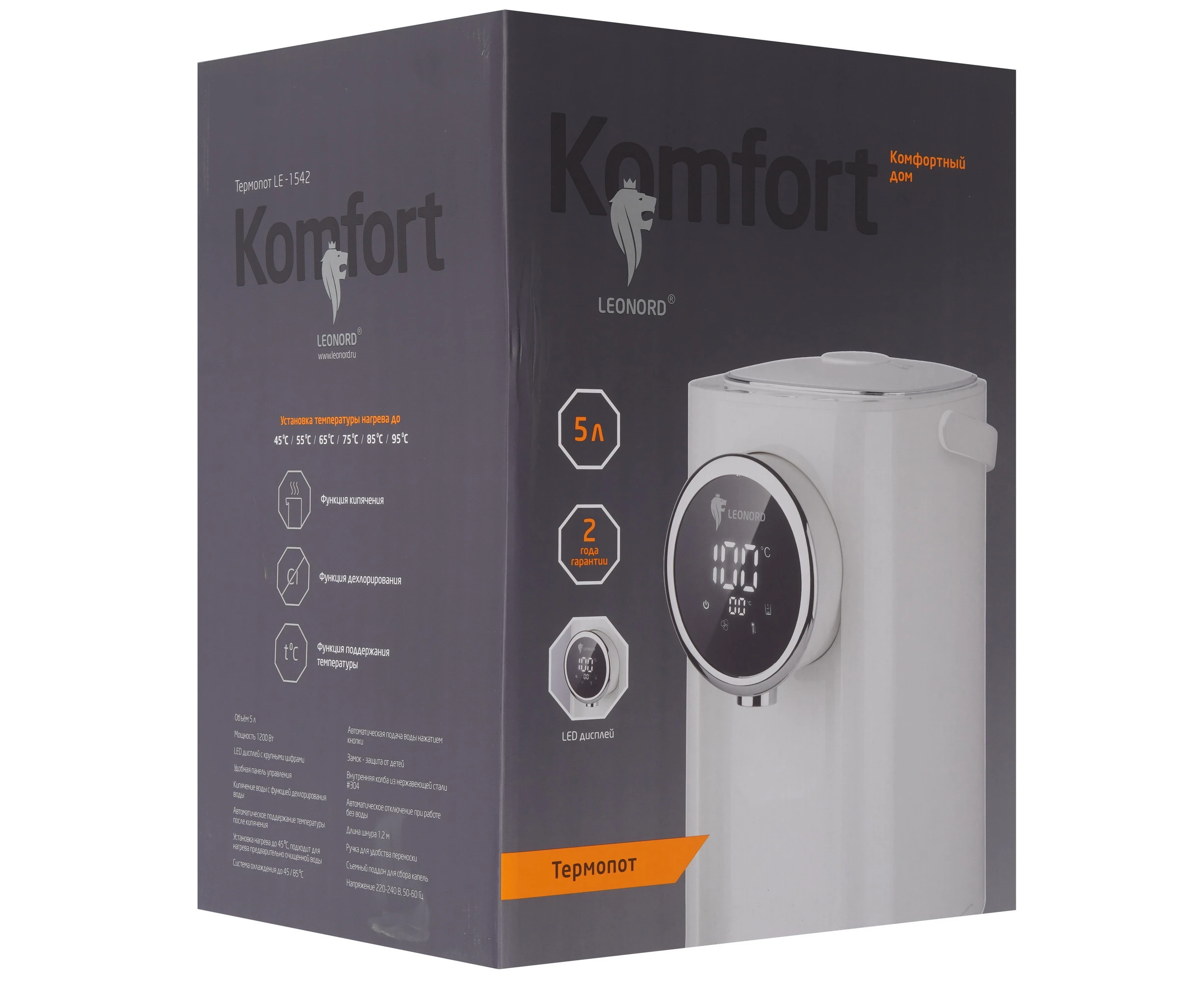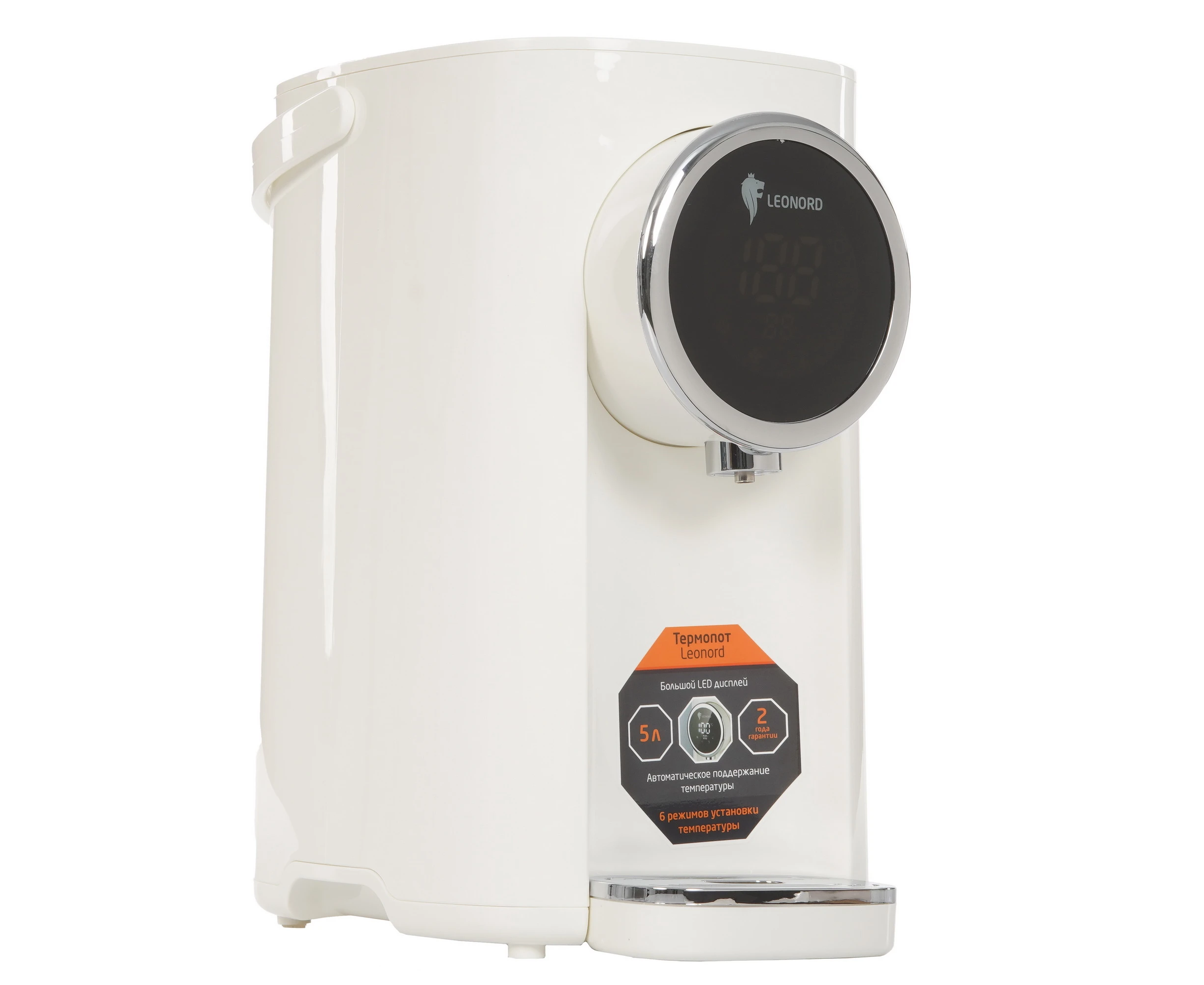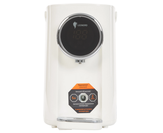 Термопот Leonord LE-1542 в корпусе белого цвета оборудован 3 режимами работы, в том числе для удаления хлора из воды. Кнопочная панель управления позволяет регулировать температуру нагрева от 45 C до 95 C. Функция поддержания температуры предупреждает остывание жидкости. Термопот Leonord LE-1542 имеет дисплей, который отображает выбранные параметры работы. Блокировка ограничивает возможность включения прибора при нехватке воды в 5-литровом резервуаре. Съемная крышка упрощает очистку и наполнение емкости. Ручка служит для транспортировки модели. Влага поступает в съемный поддон.