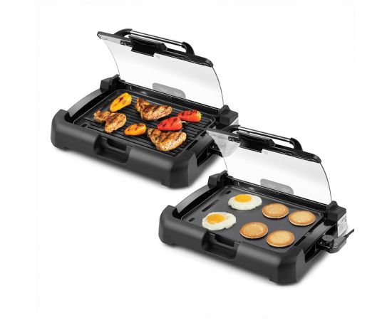 Накрывается гриль крышкой из закалённого стекла, через неё можно наблюдать за процессом приготовления. Удобная ручка не нагревается. Крышка фиксируется в верхнем положении, поэтому вам не придётся её снимать и искать дополнительное место на столе.