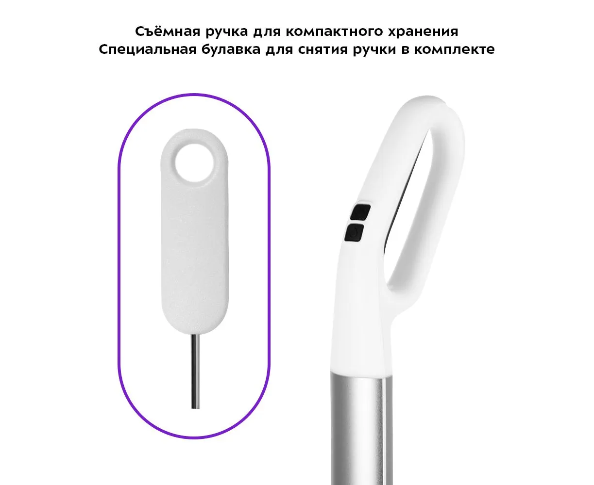 Конструкция швабры позволяет снять ручку для более компактного хранения. Для снятия в комплекте предусмотрена специальная булавка, чтобы было удобнее это сделать.