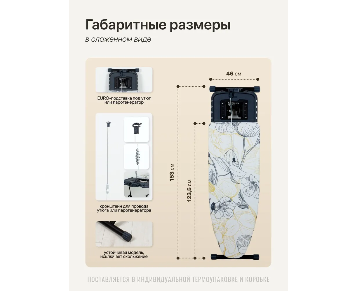Широкая гладильная доска предназначена для глажки белья. Модель оснащена электросоединителем и эргономичной подставкой под утюг.