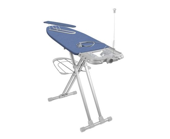 Широкая гладильная доска с электросоединителем и подставкой под утюг и парогенератор. Вместительная полка для белья и переносной подрукавник.