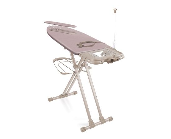 Широкая гладильная доска с электросоединителем и подставкой под утюг и парогенератор. Вместительная полка для белья и переносной подрукавник.
