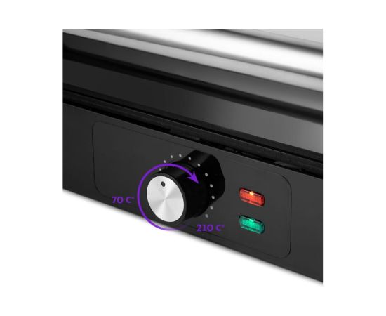 Гриль оснащен термостатом для поддержания температуры панелей, а также индикаторами питания и нагрева. С помощью регулятора температуры вы сможете плавно менять температуру приготовления.