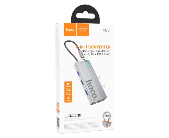 Хаб HOCO HB51 Wow 6-in-1 multi-function converter HDTV+RJ45+PD+USB3.0*3 deep space gray