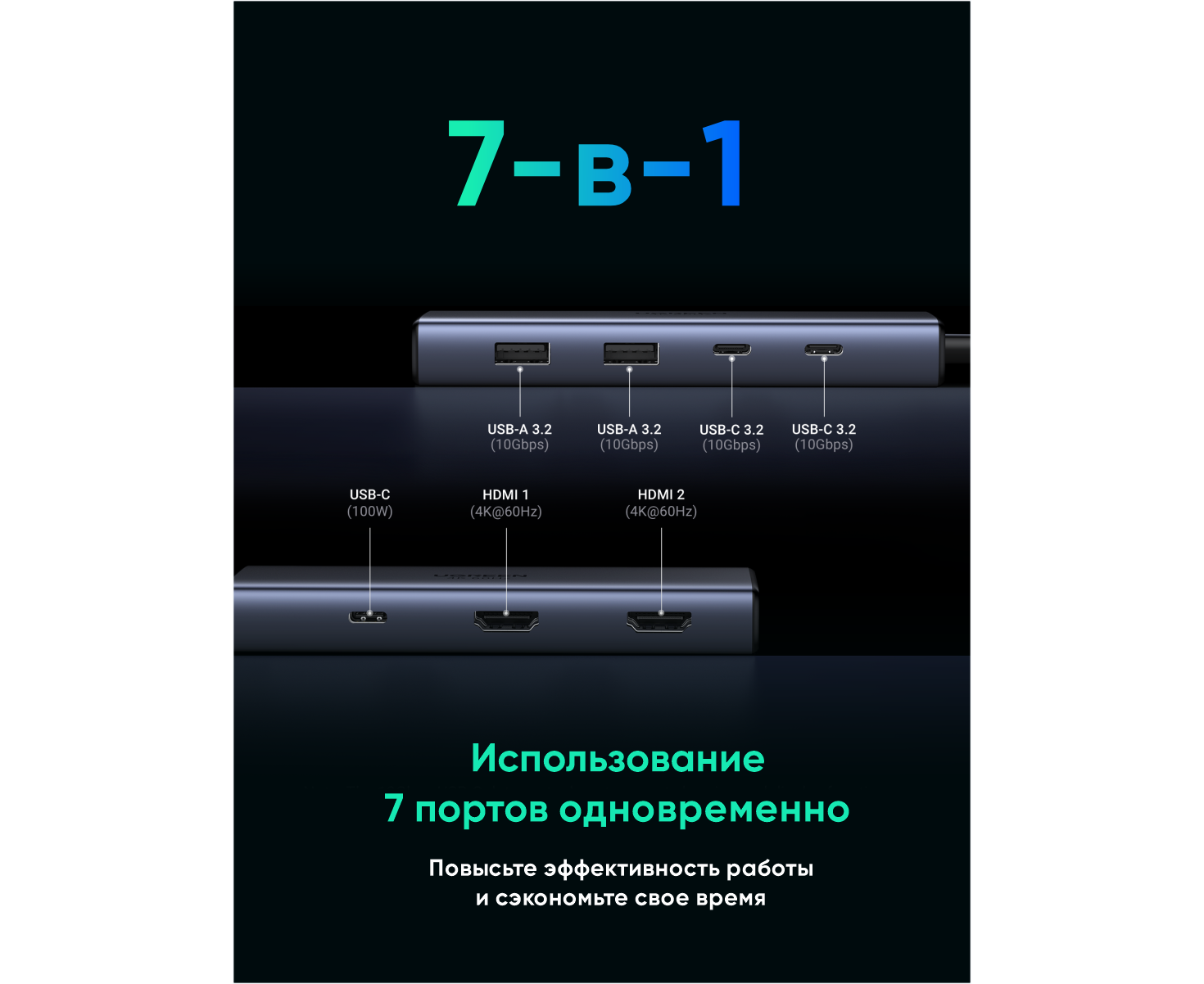 Конвертер UGREEN 4-in-1 4K@60Hz USB-C to 2*USB-A 3.2+2*USB-C 3.2+2*HDMI+PD Port Converter. Цвет: серый