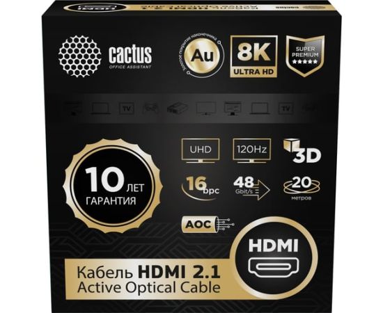 Кабель аудио-видео Cactus CS-HDMI-AOC-2.1-20, HDMI(m)-HDMI(m) ver 2.1, 20м, Gold, черный